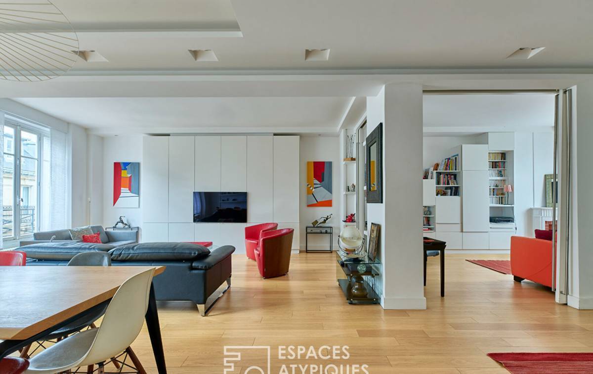 It combines a 46 sqm double living room and a 16 sqm office space. The existing sliding doors make it easy to partition the two volumes, creating a second living room, a reading corner, or a second bedroom as needed.