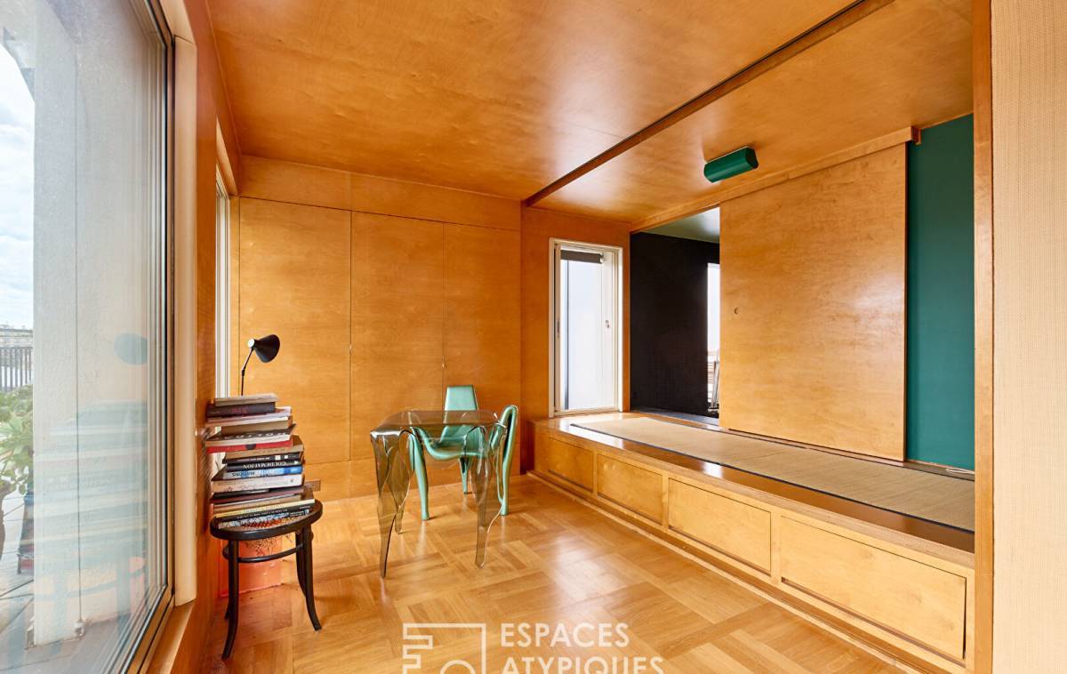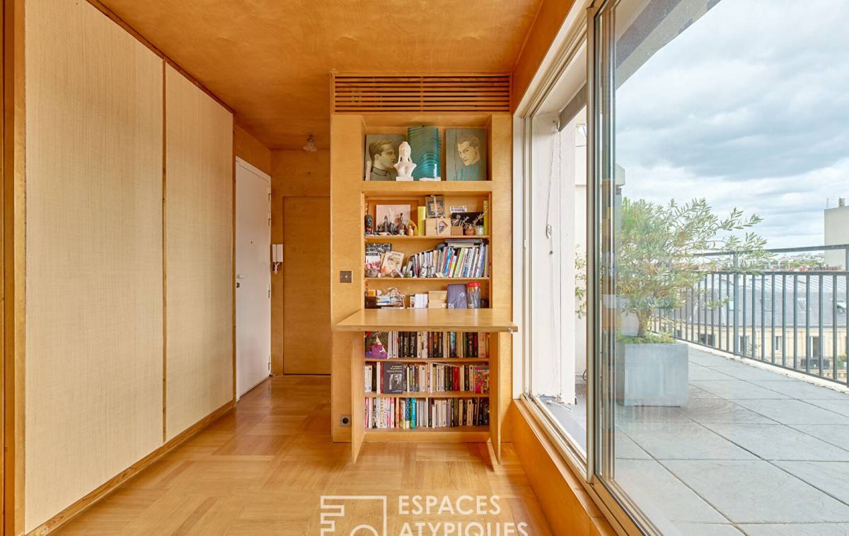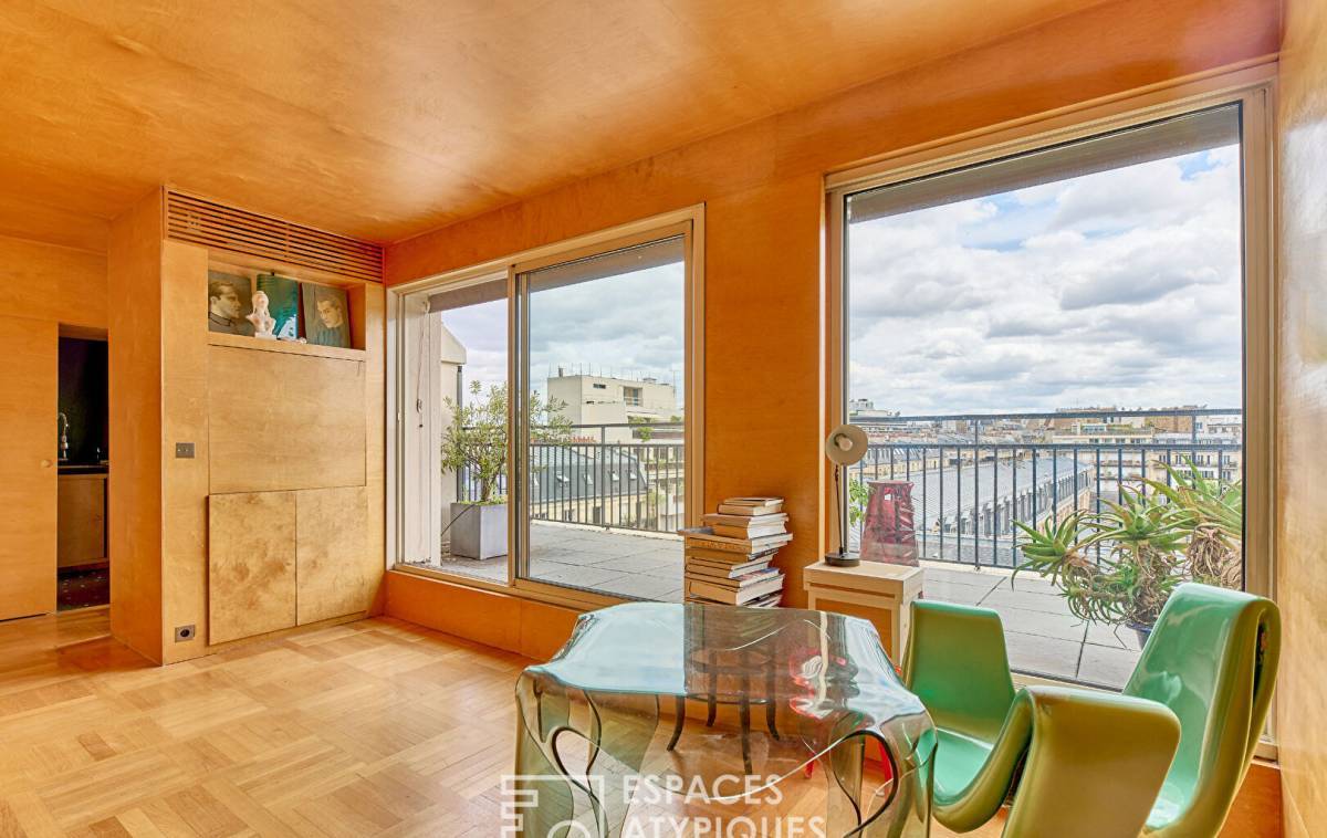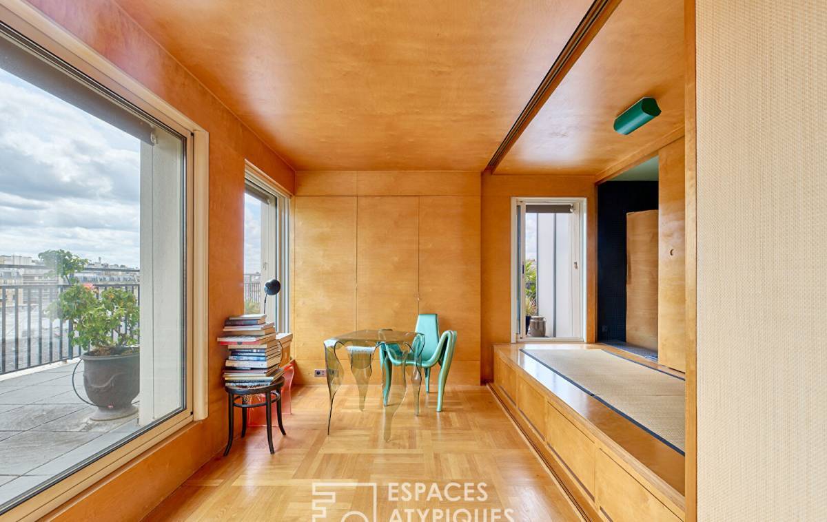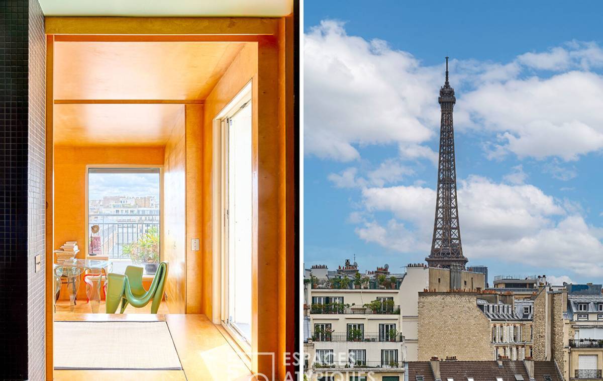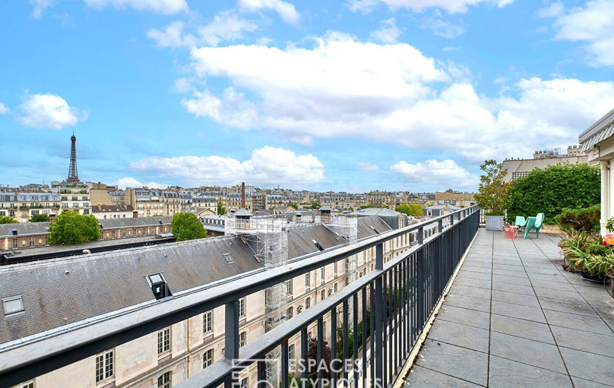 The exterior is the main asset of this atypical apartment: the panoramic terrace, completely unoverlooked, facing East/South/West, reveals a clear view of the rooftops and the Eiffel Tower.