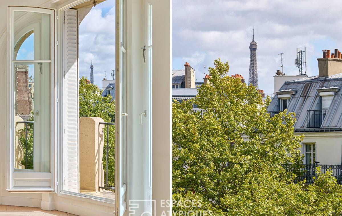 It particularly seduces with its dual-aspect character, its brightness and its pleasant unobstructed views also allowing to appreciate the top of the Eiffel Tower.