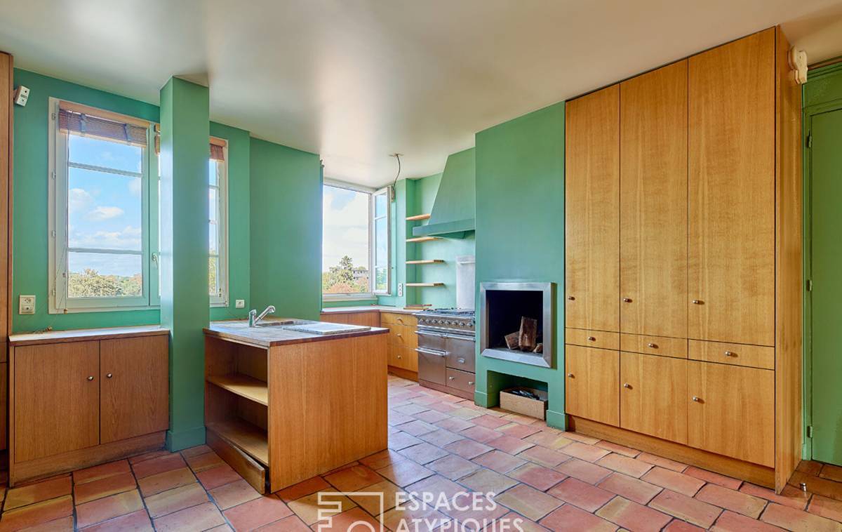 A 10 sqm entrance leads to a bright living room of almost 40 sqm, decorated with a custom-made library and a contemporary fireplace. It is extended along its entire length by a comfortable balcony.