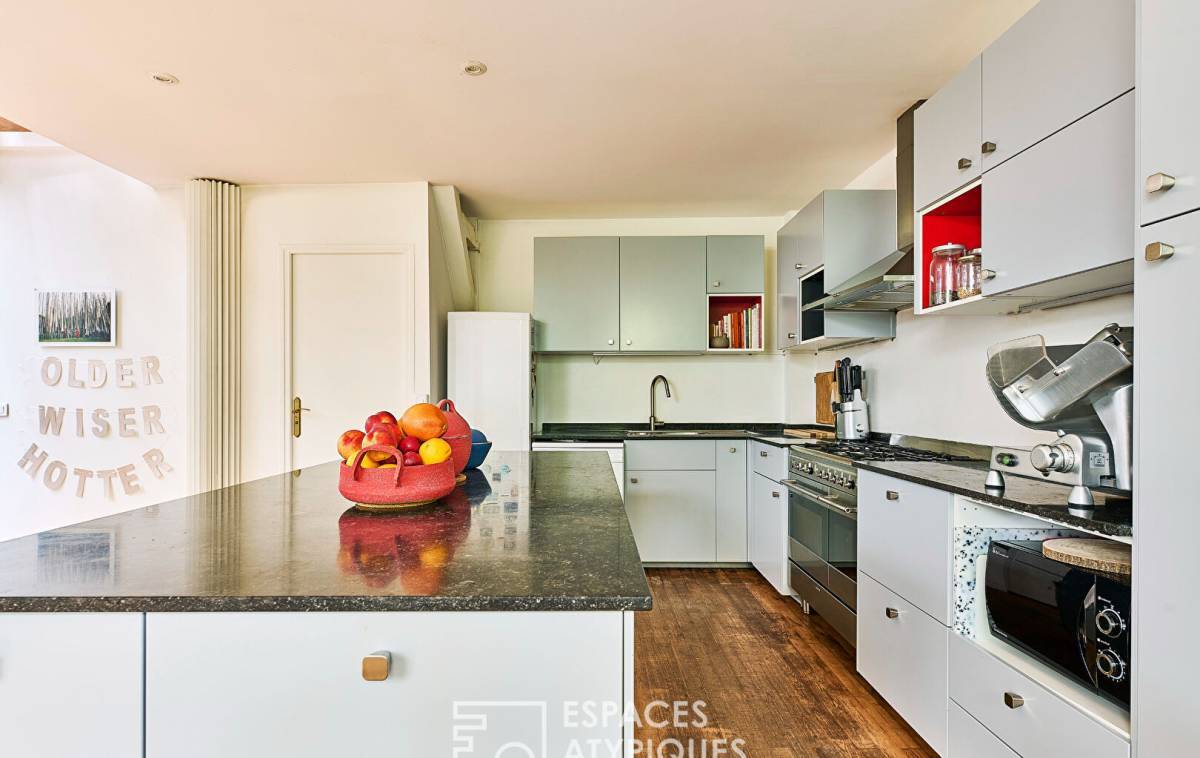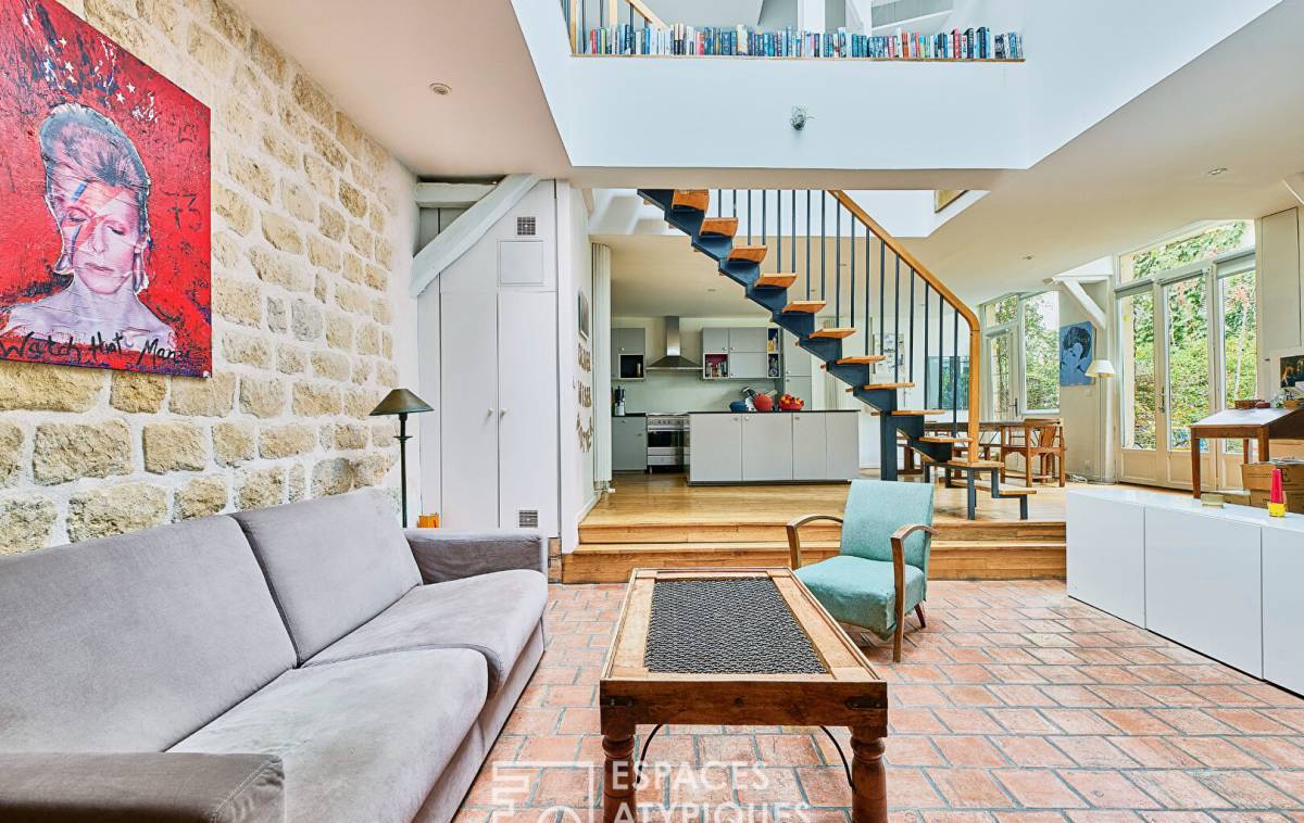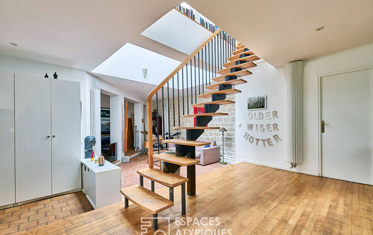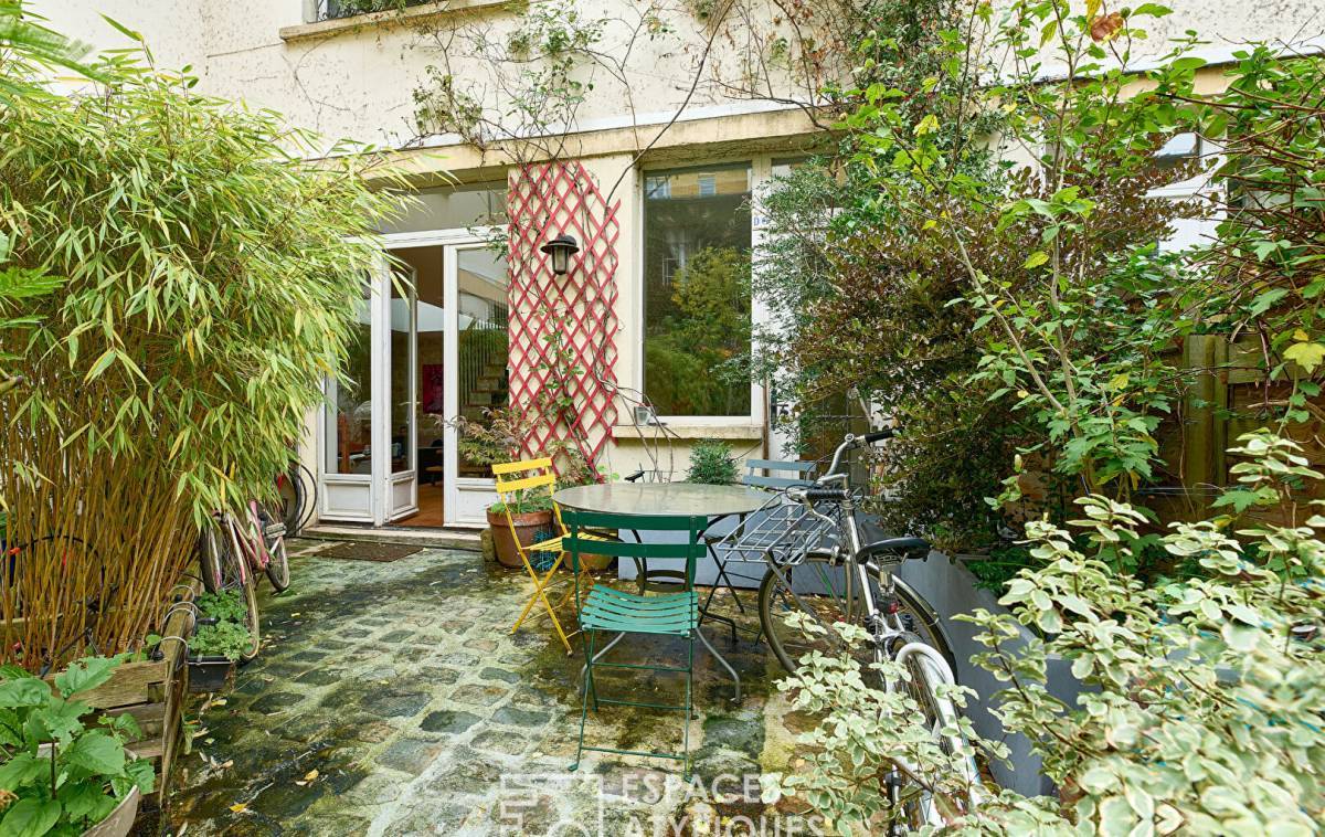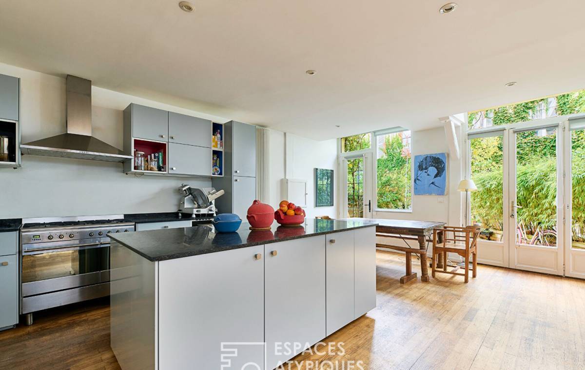 Located just steps from the Bassin de la Villette, nestled in a discreet, flower-filled courtyard, this 141 m² (1600 sq ft) house (157 m² floor area) offers a calm, bright, and welcoming living environment.