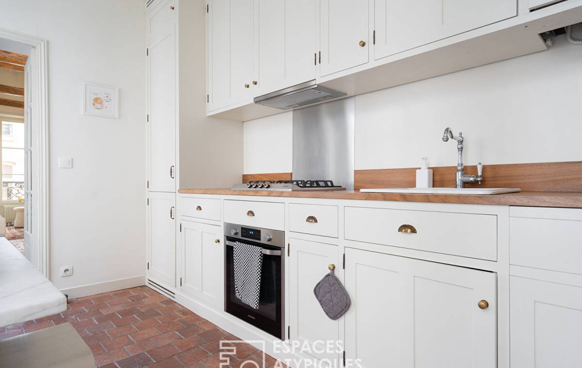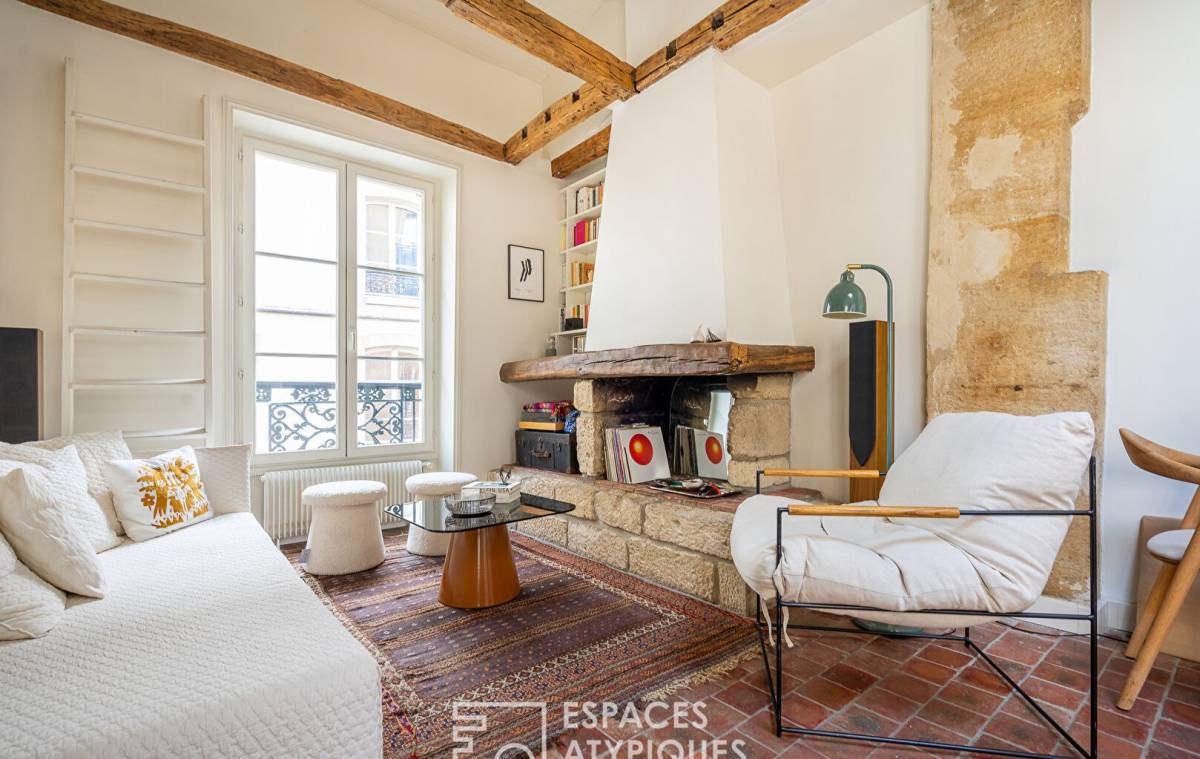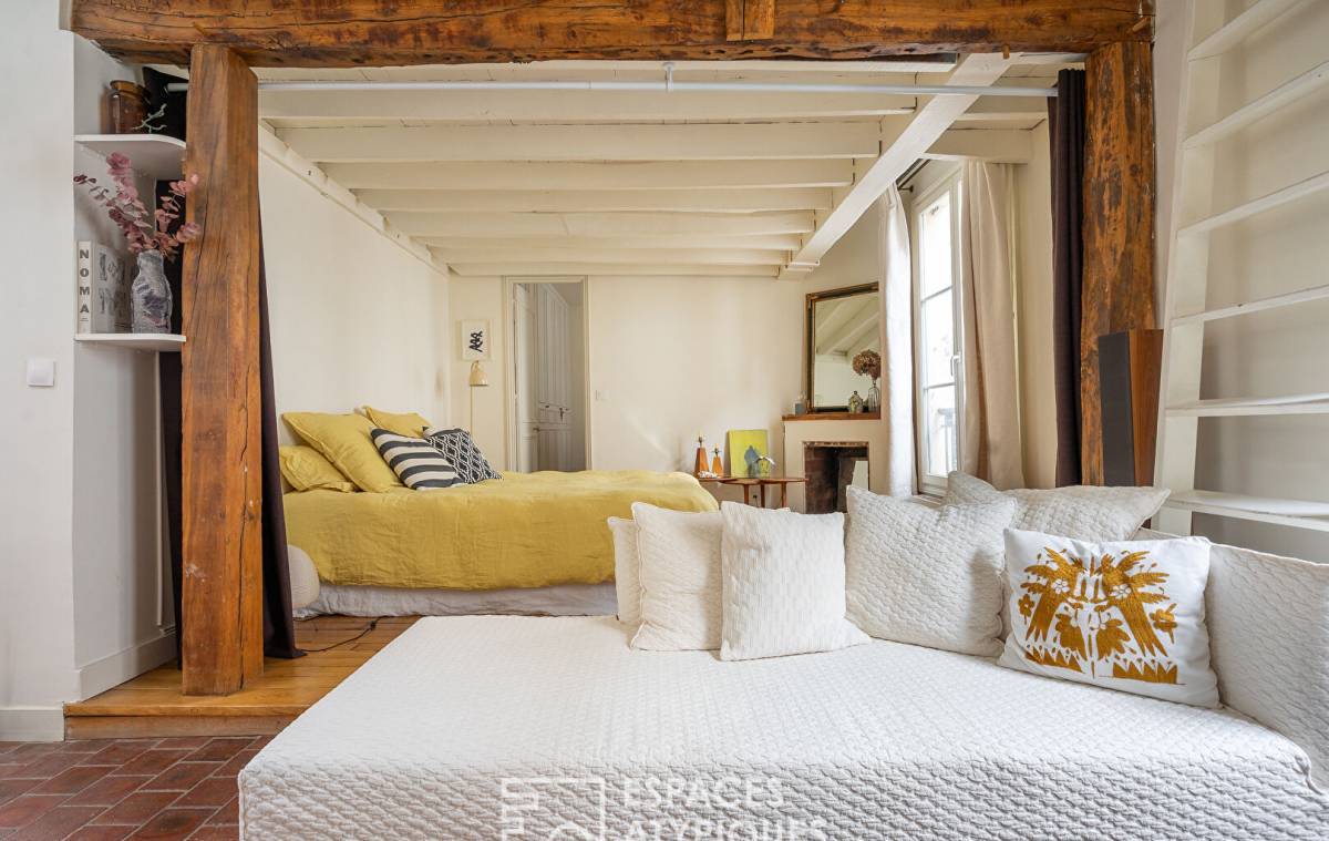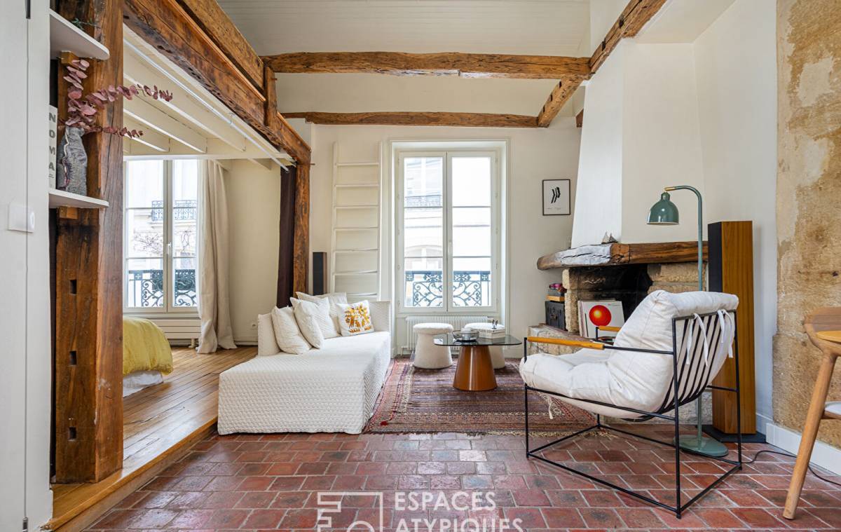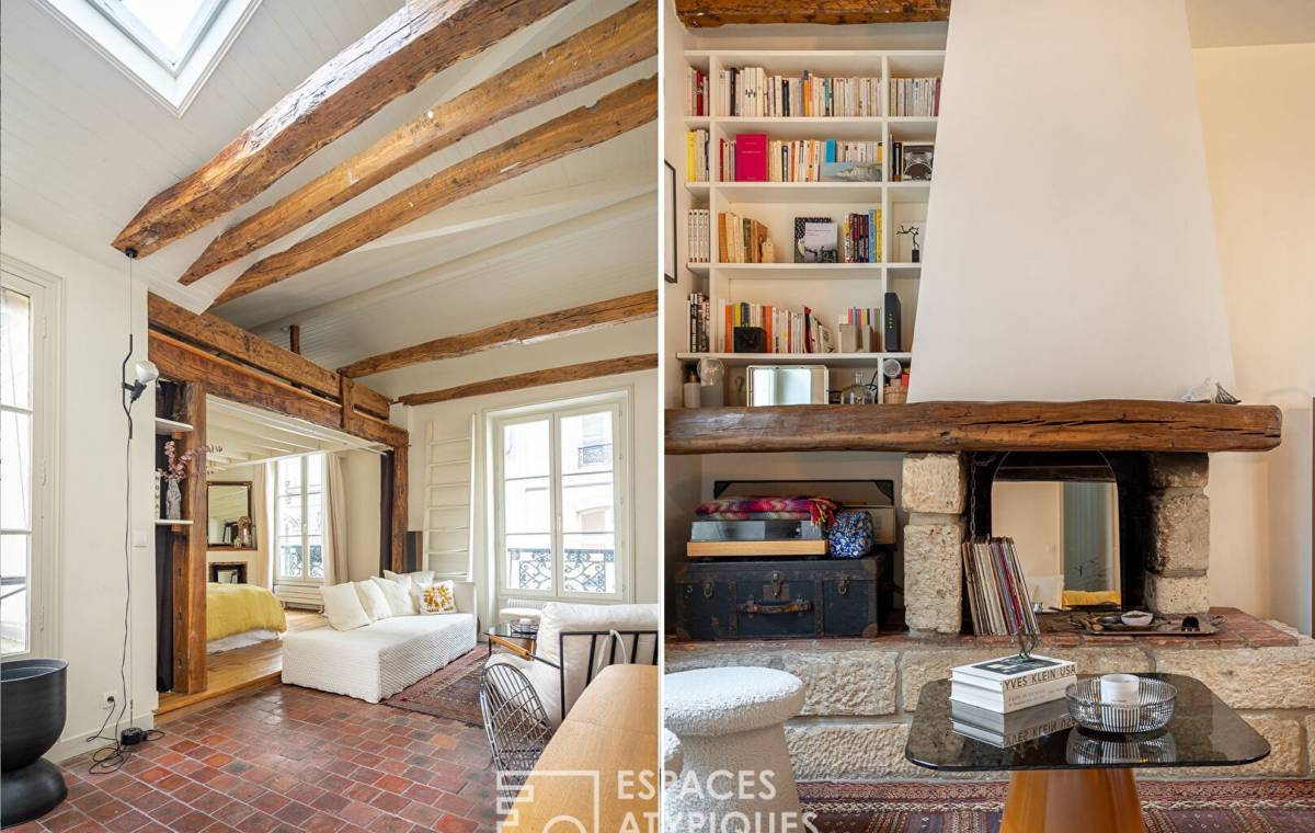 With its 3.70-meter high ceilings, terracotta tiles from a château, and fireplaces, it's a truly charming apartment in the heart of the Marais.