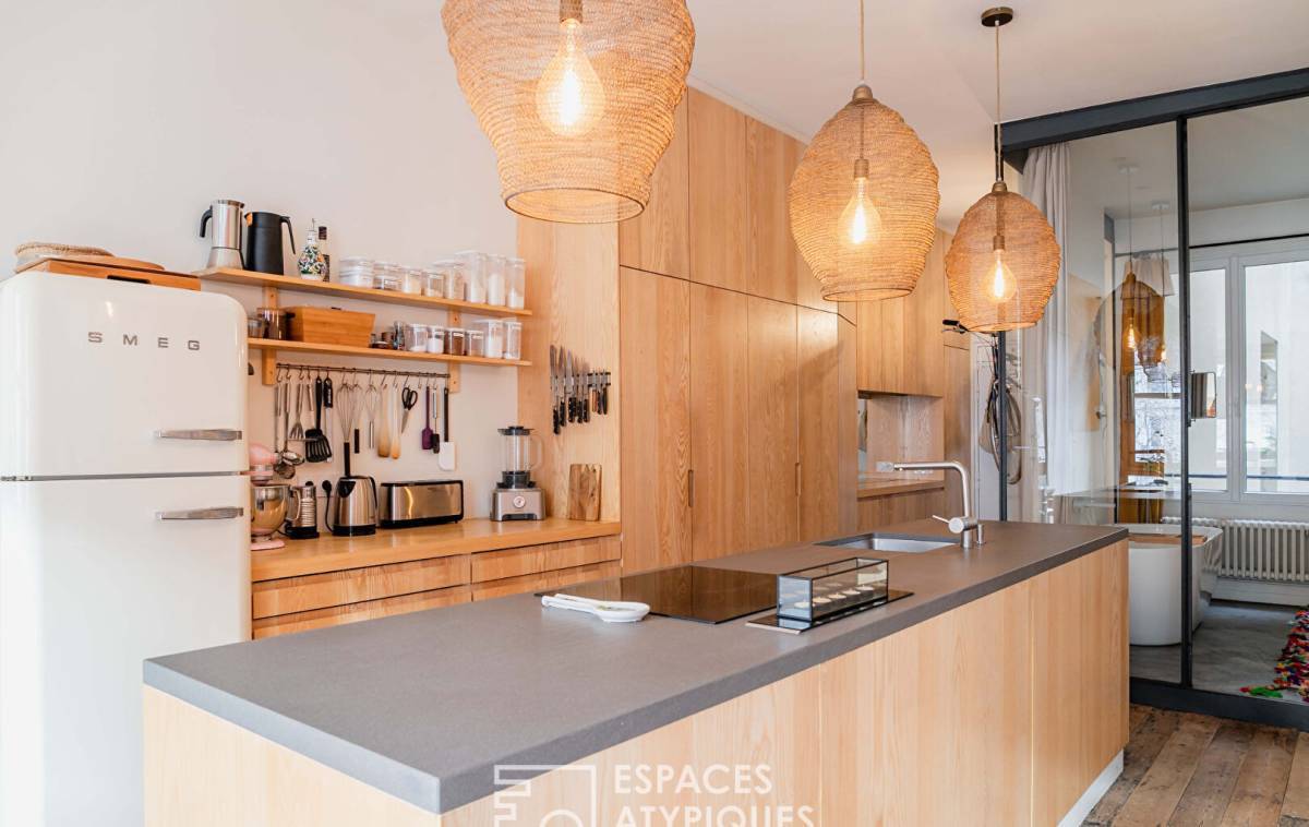 The entrance, fitted with numerous custom-made storage spaces and equipped with parquet flooring from an old factory, opens onto a kitchen equipped with a central island as well as a spacious living room with a total surface area of ??37m², bright thanks to two large sash windows facing south.