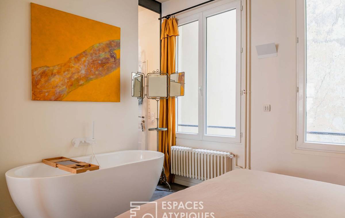 The bedroom with its bathtub, resembling a hotel suite, is nestled behind a glass roof and overlooks the quiet courtyard, it is completed by a walk-in dressing room and a bathroom.