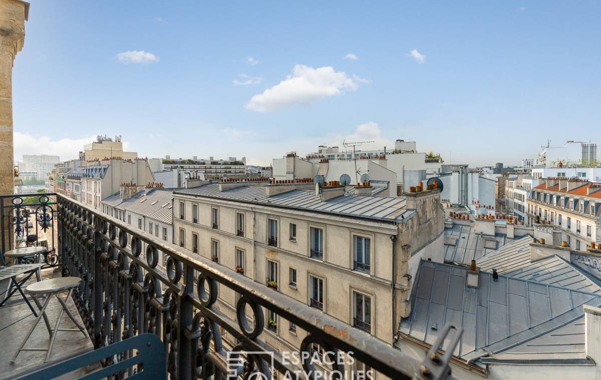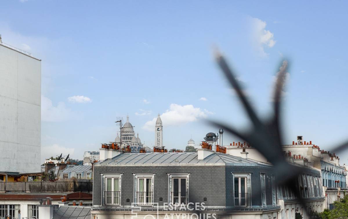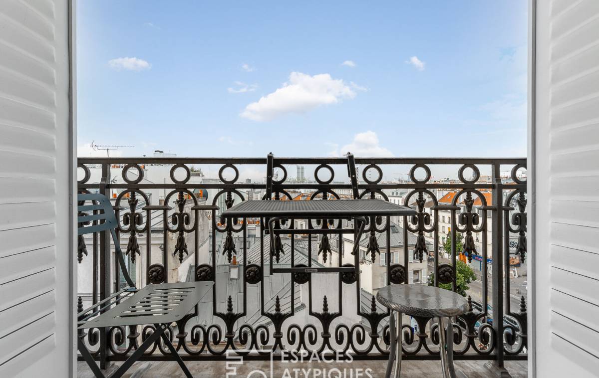 The balcony extends the living space and offers a view of the Sacré-Coeur Basilica.
