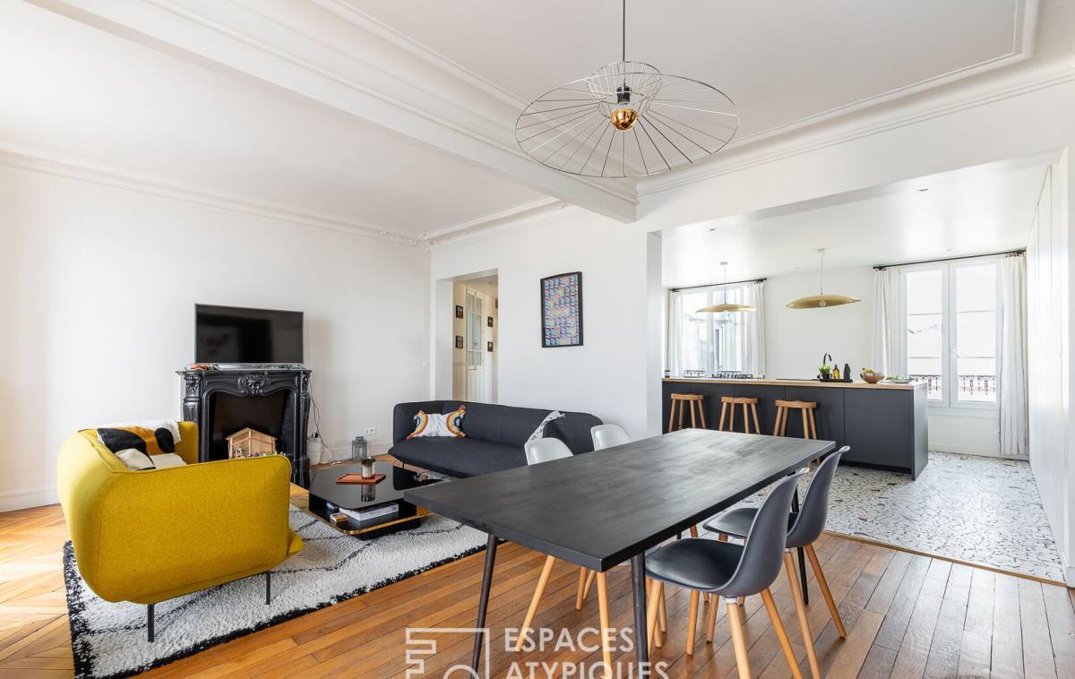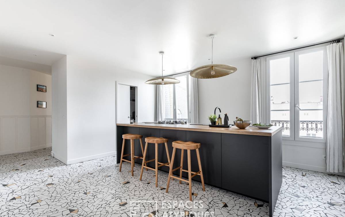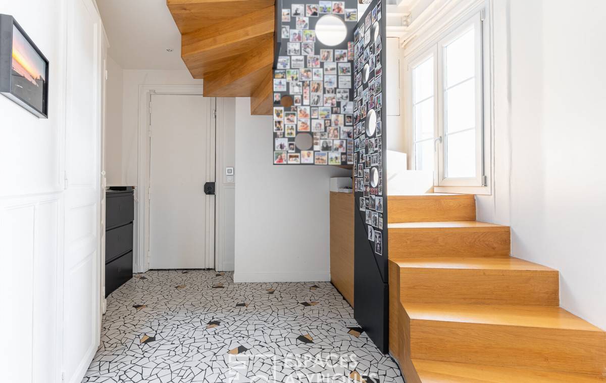 The spaciousness, layout, natural light, and contemporary décor--combining light wood tones, constellation-patterned floor tiles with touches of black, and Haussmannian features--make this duplex a family apartment with undeniable charm and subtle character.