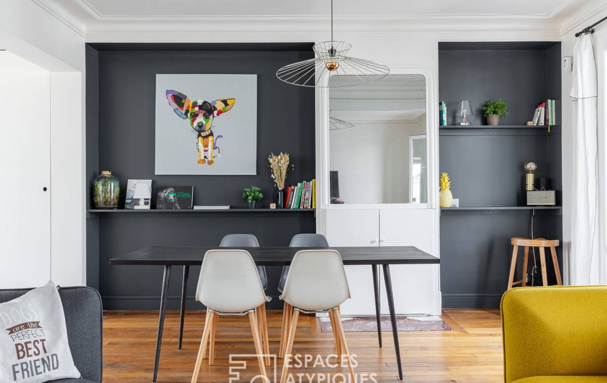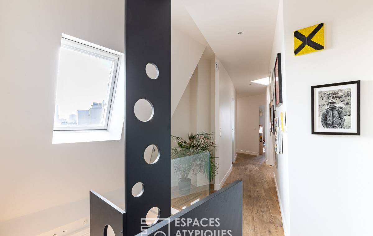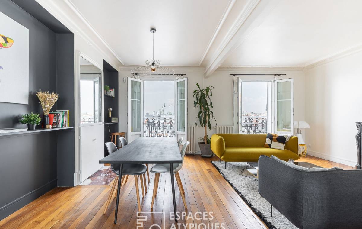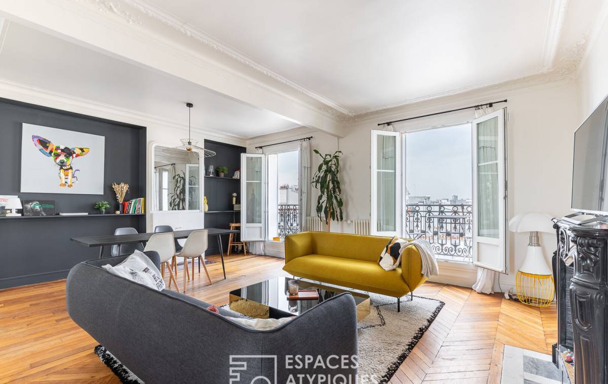 The spaciousness, layout, natural light, and contemporary décor--combining light wood tones, constellation-patterned floor tiles with touches of black, and Haussmannian features--make this duplex a family apartment with undeniable charm and subtle character.
