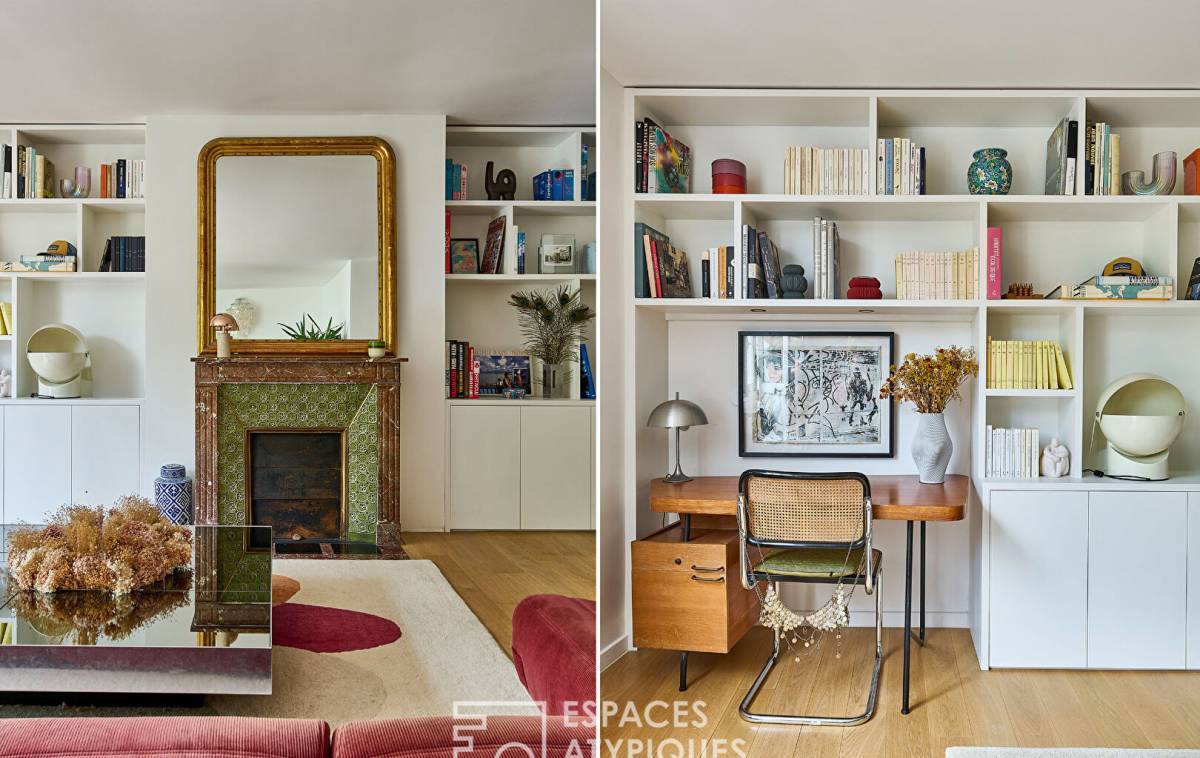 The entrance hall, equipped with storage, opens onto a vast double living room, the true heart of the apartment. Facing west, it benefits from beautiful light and opens onto the large balcony. An antique fireplace highlights the warm character of this double reception room.