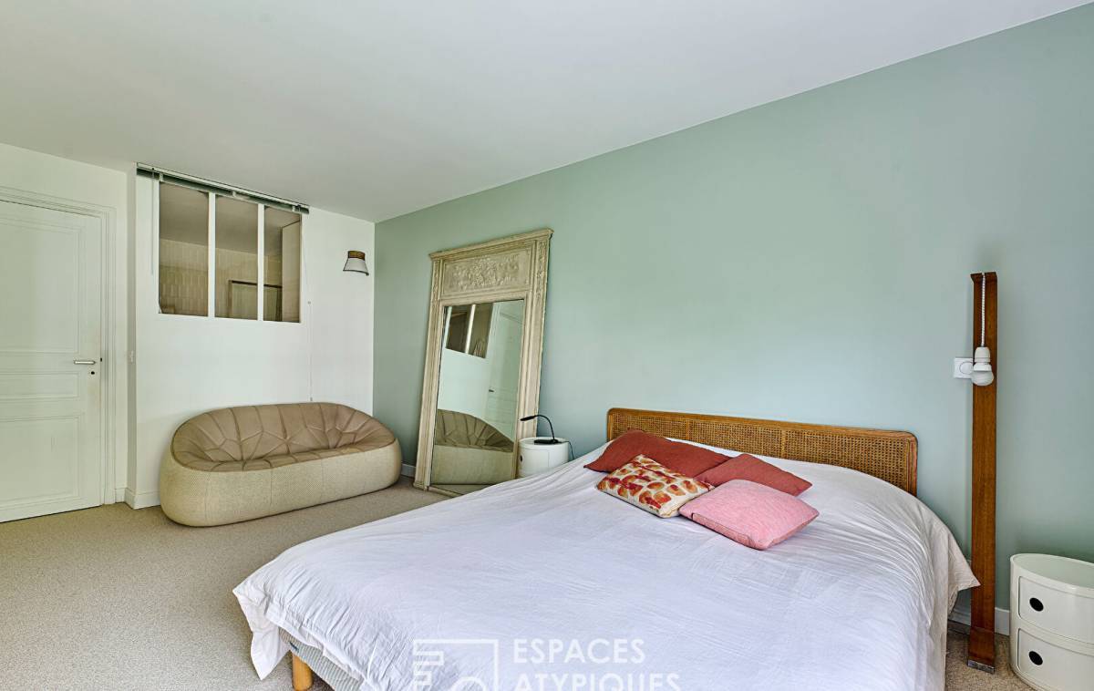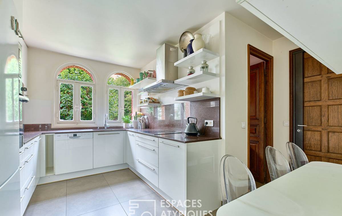 Opposite, the independent kitchen, facing east and overlooking the garden, boasts a breakfast nook and two superb arched windows, which bring a touch of originality and poetry to the whole.