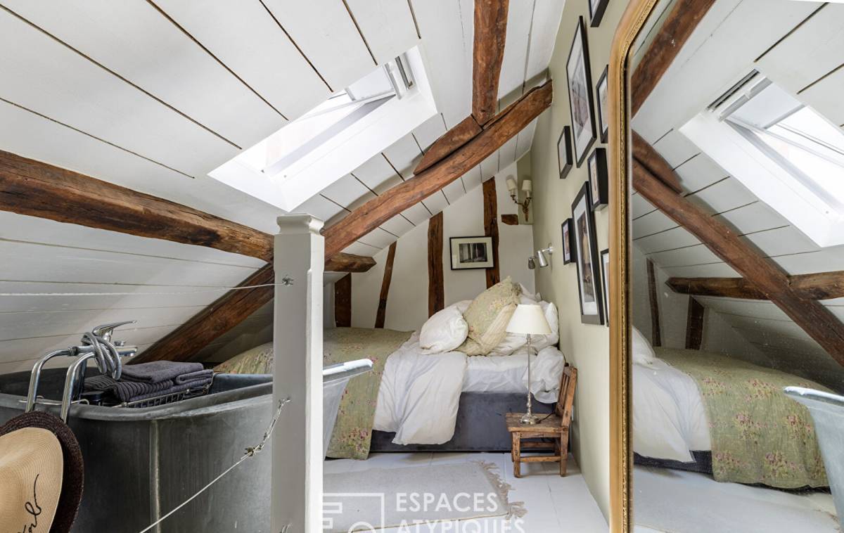 On the lower floor, a more intimate space is revealed, featuring an attic bedroom with a cast-iron bathtub, a bathroom with a dressing room, and a separate toilet.