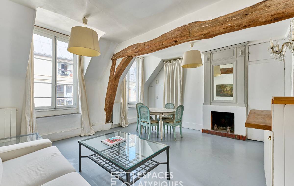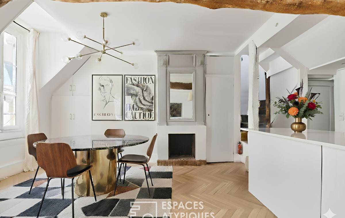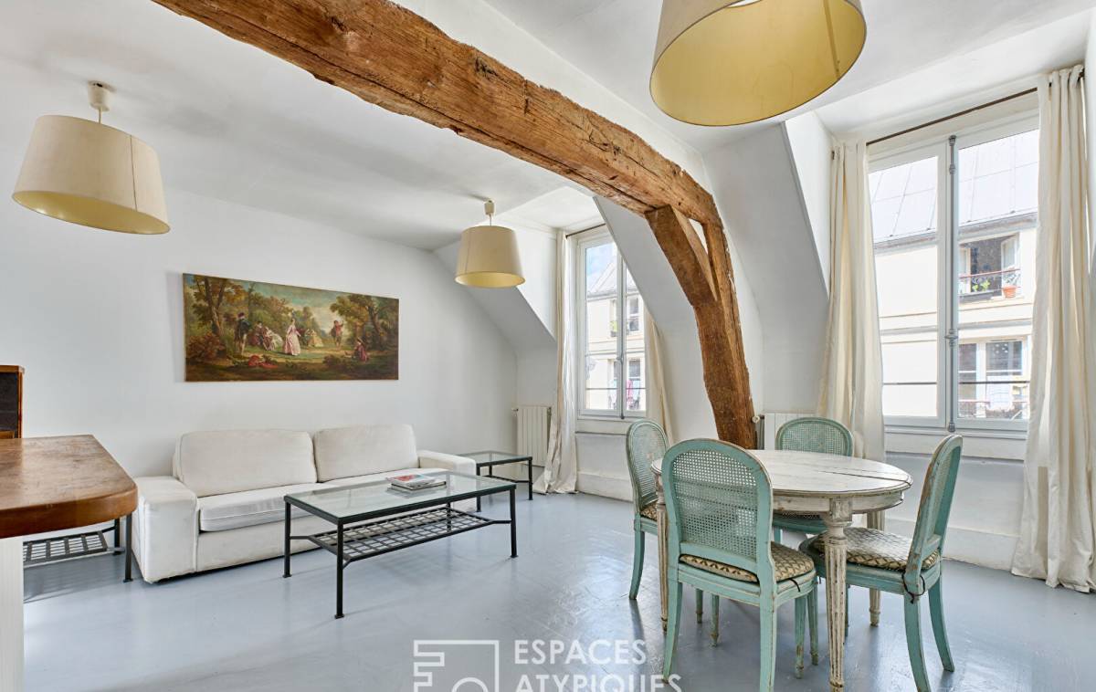 In the heart of the Archives district, this 97.88 m² duplex (75.06 m² Carrez law) is located on the top two floors of a 17th-century building, nicknamed "the building of the greats," which was a literary hotspot in the 17th and 18th centuries.