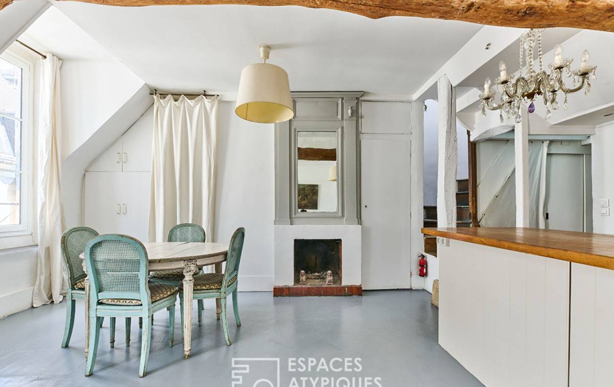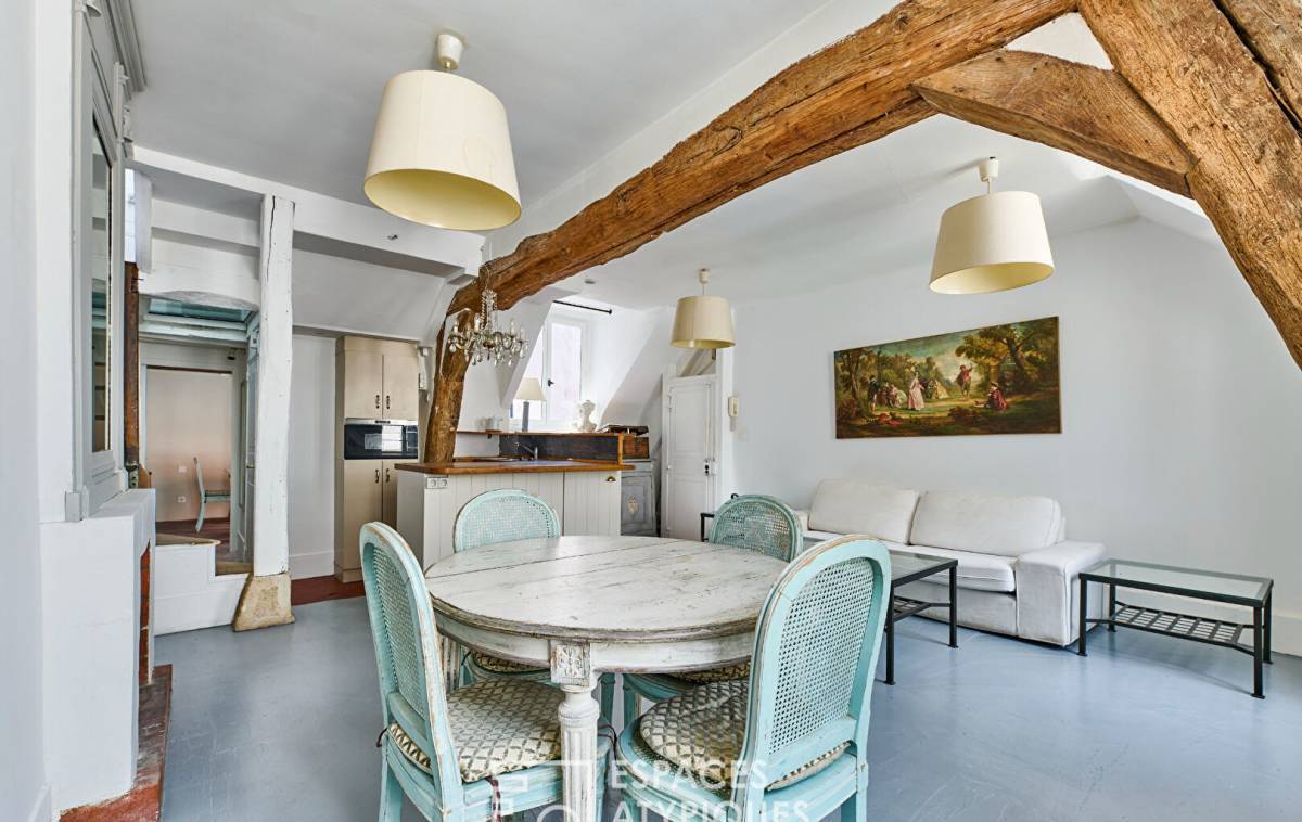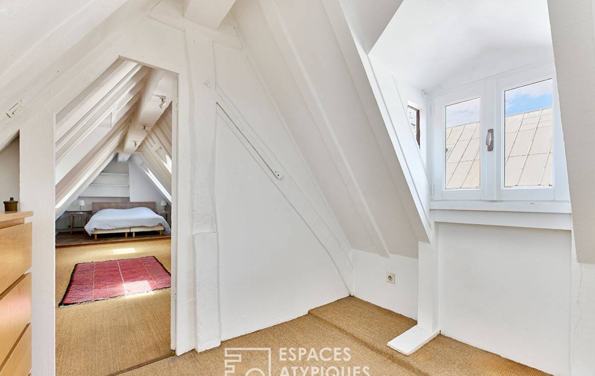 The triple exposure and various openings ensure beautiful light throughout the day. The apartment, nestled under the eaves, enjoys absolute tranquility while being located in the heart of a lively historic district.