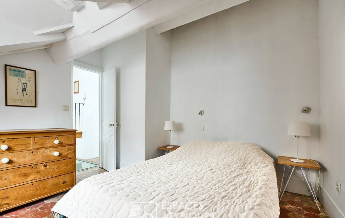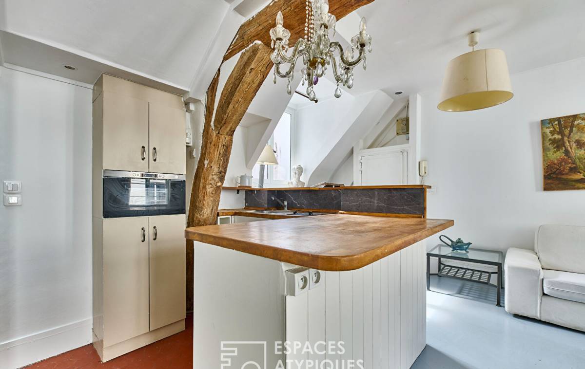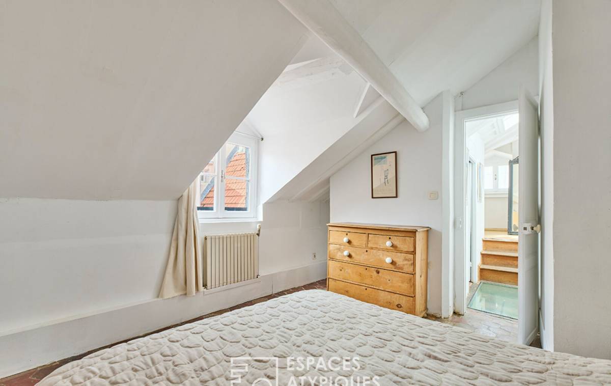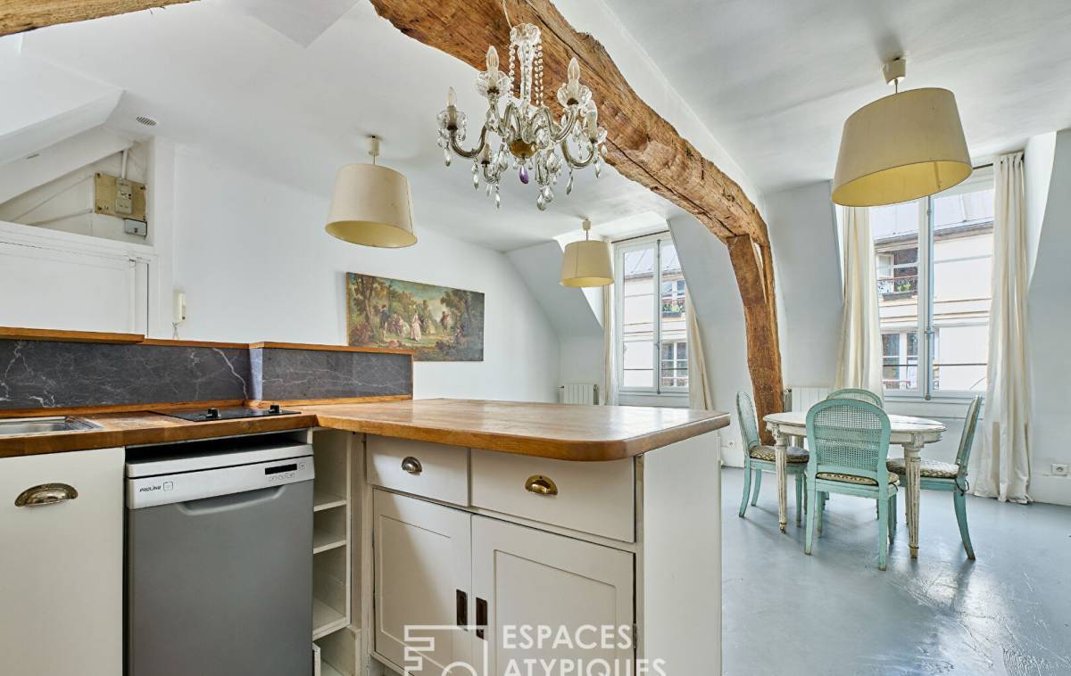 The triple exposure and various openings ensure beautiful light throughout the day. The apartment, nestled under the eaves, enjoys absolute tranquility while being located in the heart of a lively historic district.