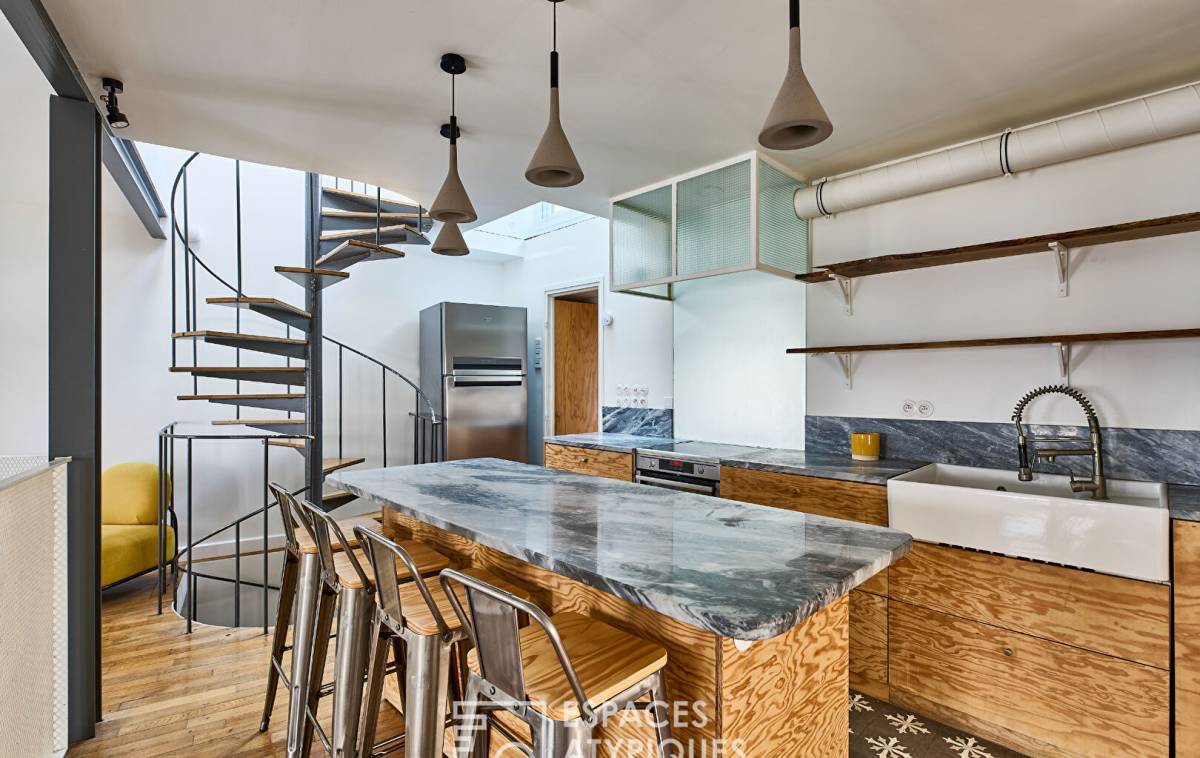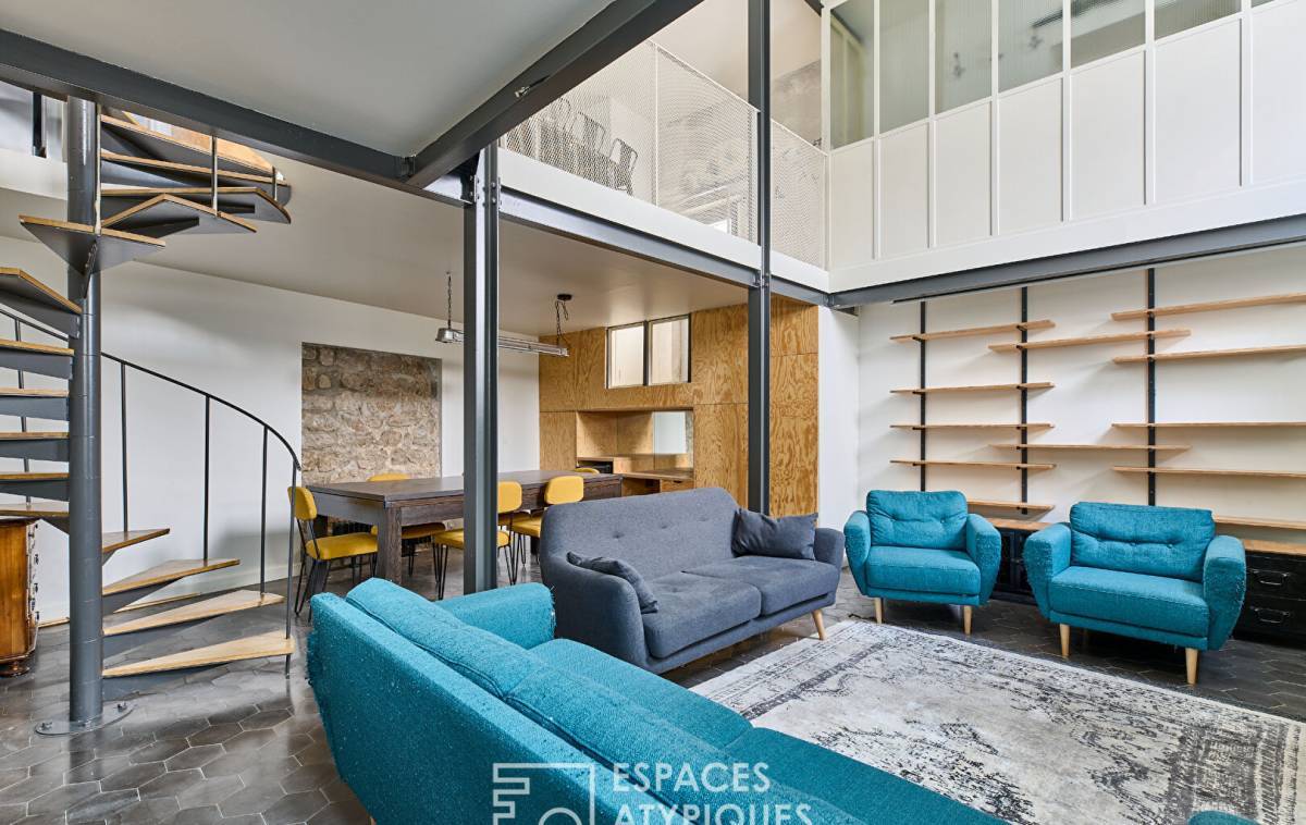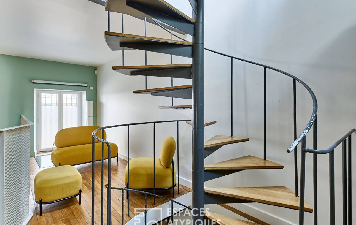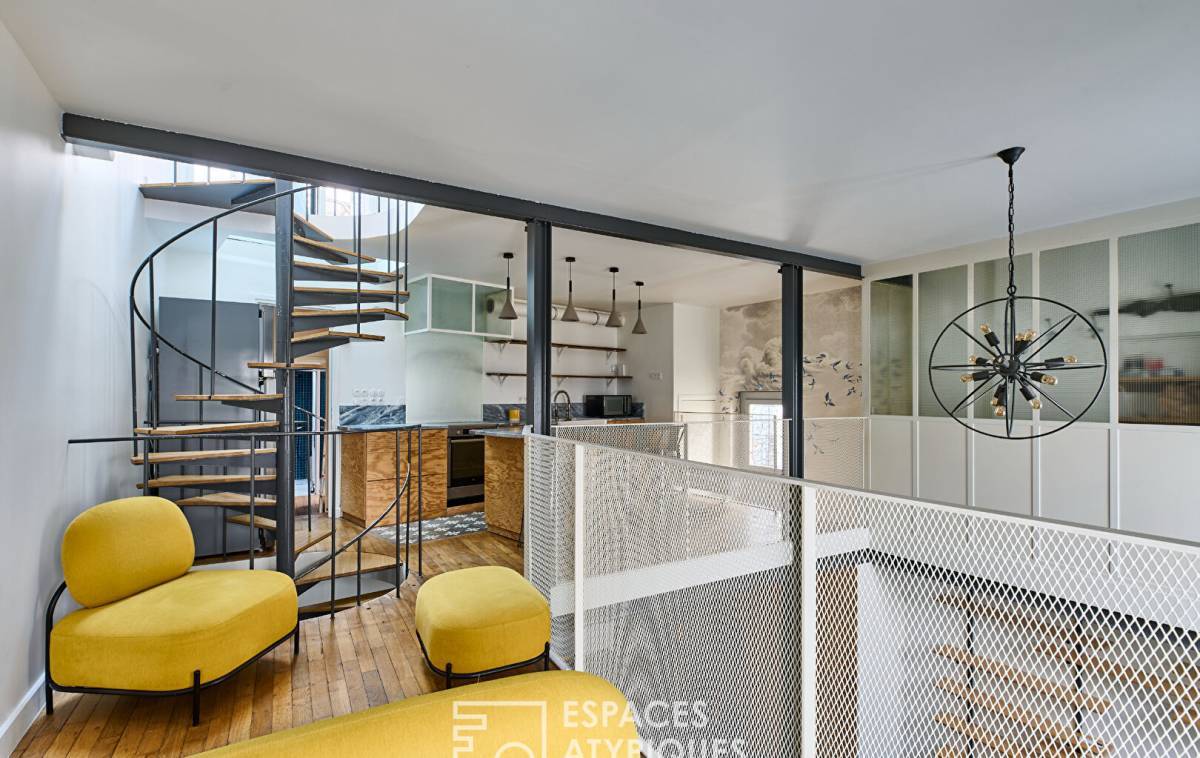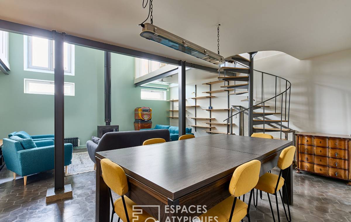 A lounge area extends this level. A spiral staircase made of wood and metal leads to a vast living/dining room of nearly 40 sqm nestled below. The latter houses a stove, adding a warm touch to the whole.