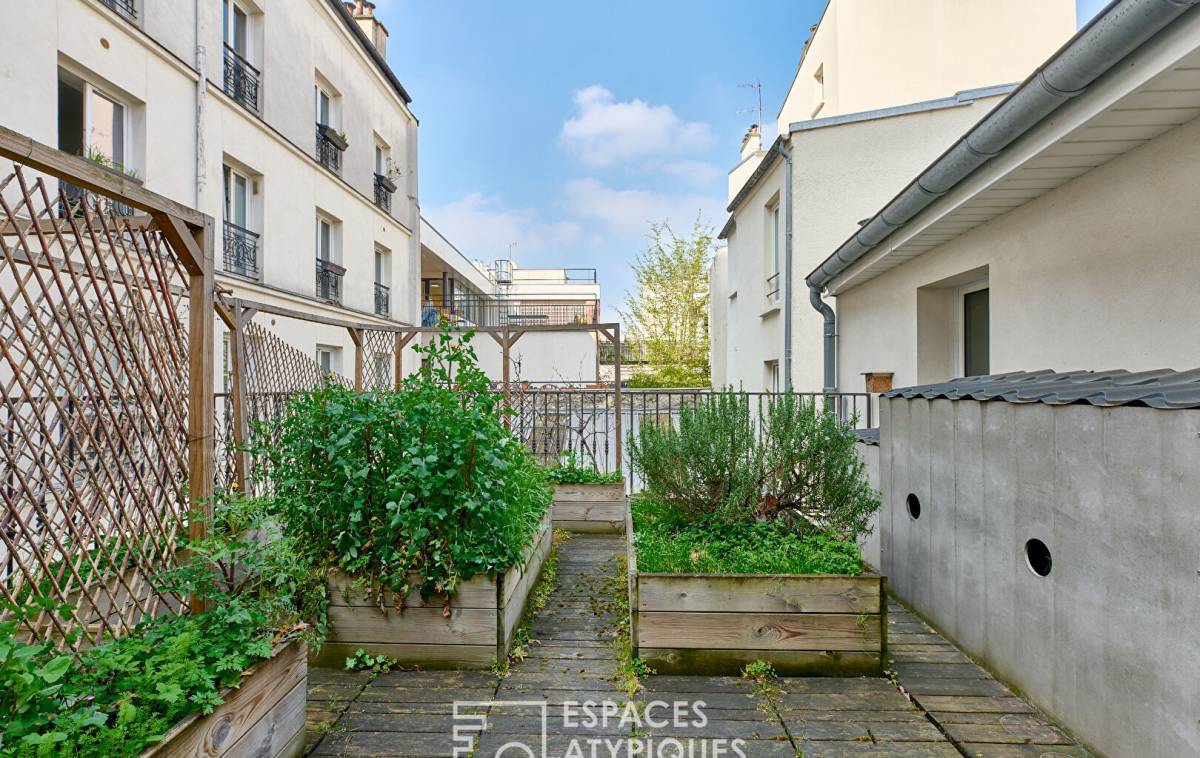 Finally, the large terrace accessible from the top landing evokes a real hanging garden, with its planters where aromatic herbs and a small market garden flourish - an absolute rarity in the neighborhood.