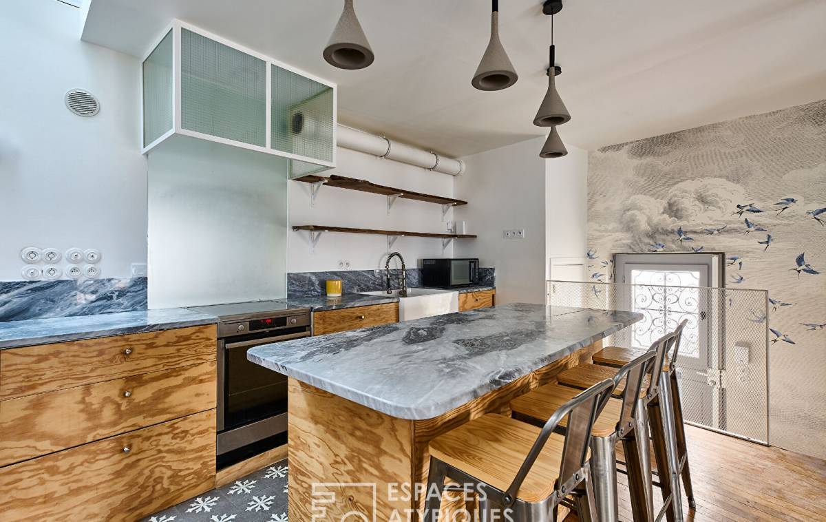 Accessible independently from the paved courtyard of a charming condominium, the entrance reveals a 23 sqm open kitchen where raw materials - wood, metal, and marble - elegantly interact.