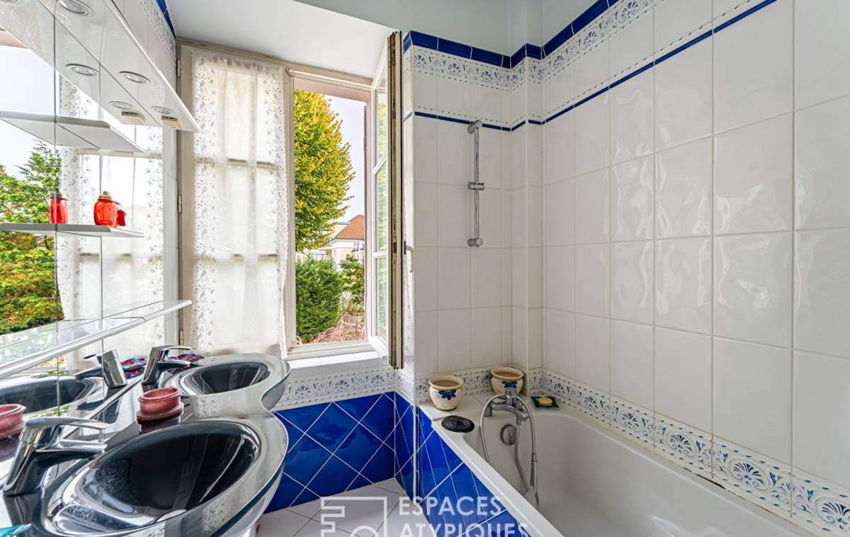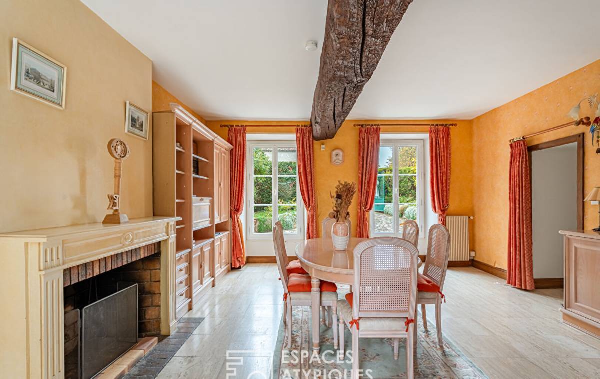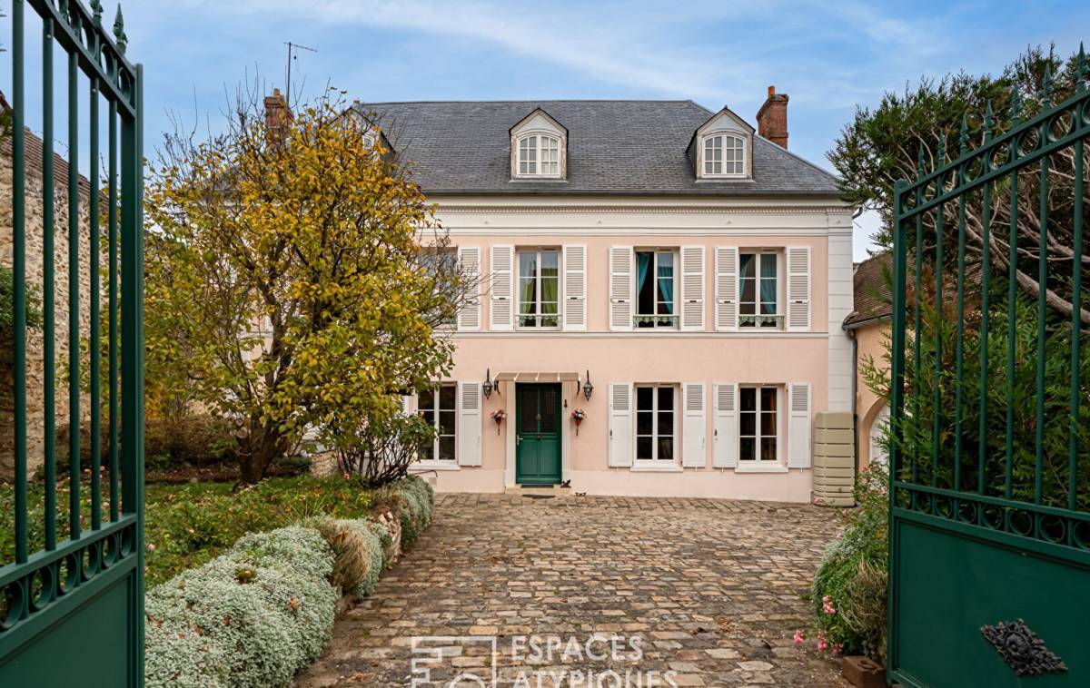 Located in the very heart of the village, facing the wooded park of the Château de Plaisir and within immediate walking distance of shops, schools and the town hall, this elegant 18th-century manor house offers 277 sqm (335 sqm total floor area) on a 1,040 sqm walled plot in decorative meulière stone, fully secluded from view.