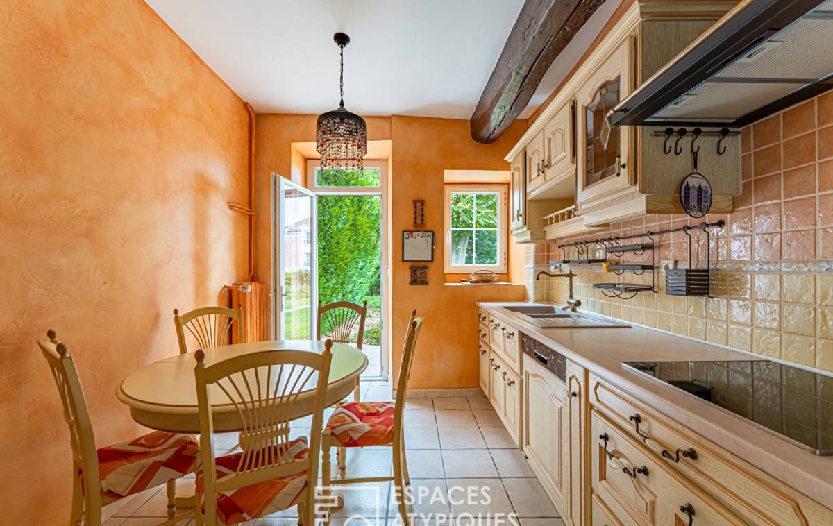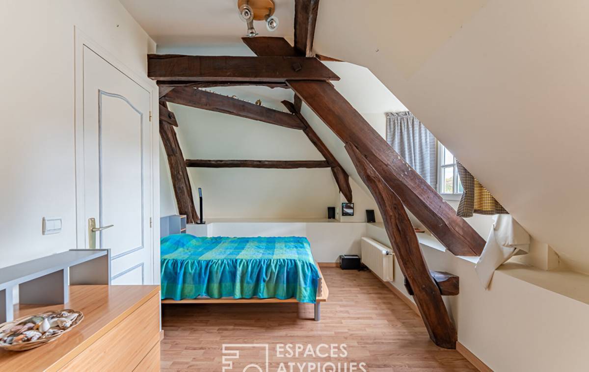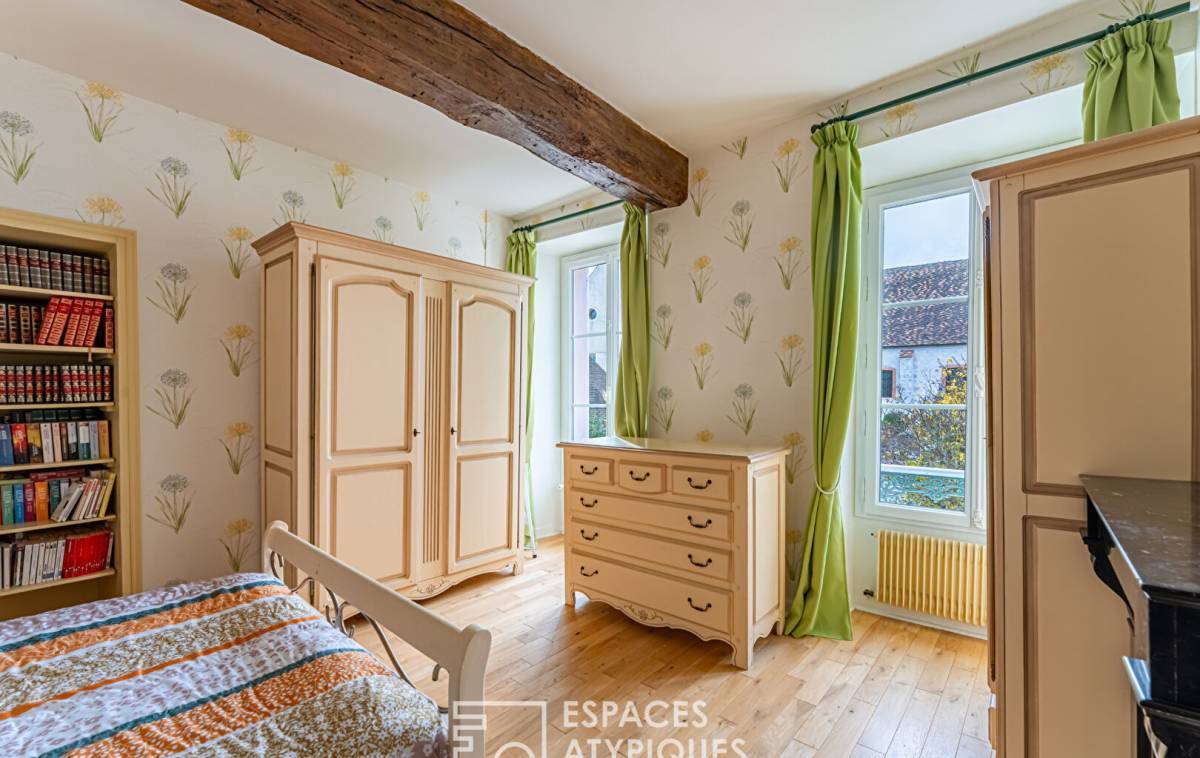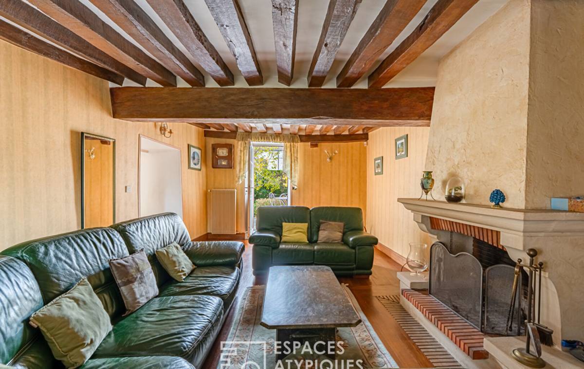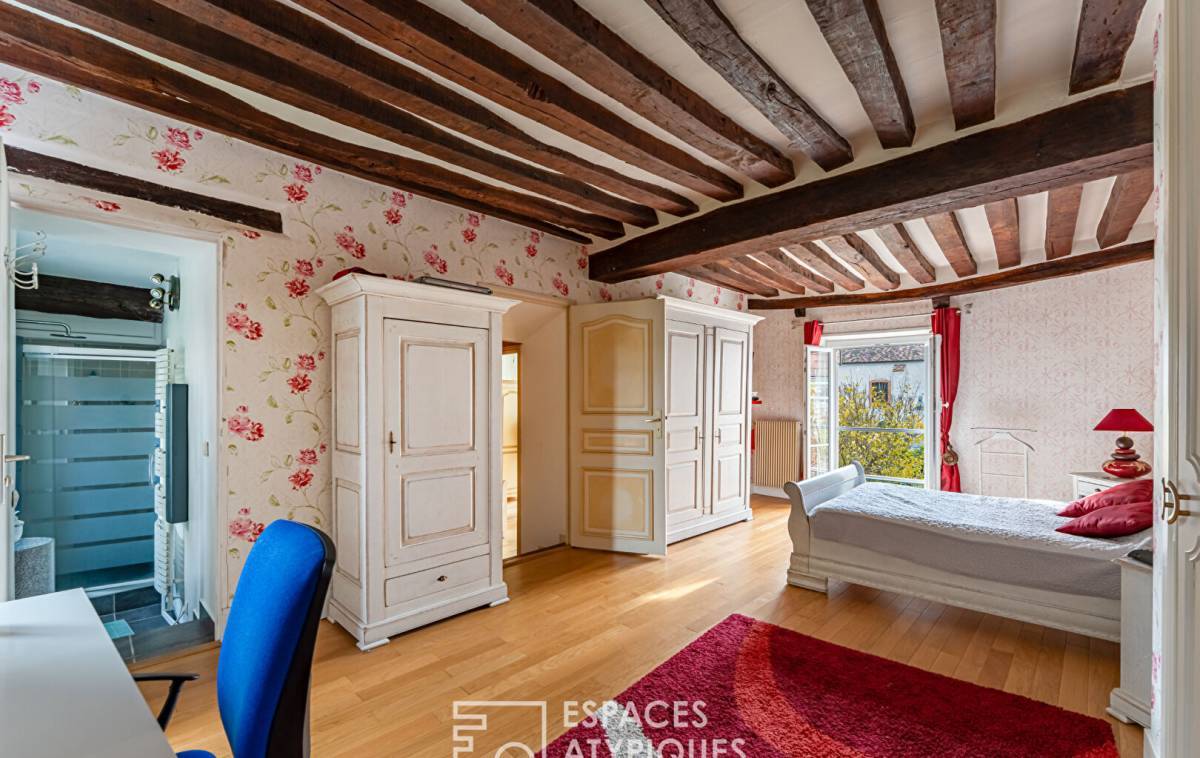 The ground floor features a spacious entrance hall, a warm living room with exposed beams and an original fireplace, a dining/reception room opening onto the courtyard and garden, as well as a fully equipped kitchen with access to the garden and a terrace.