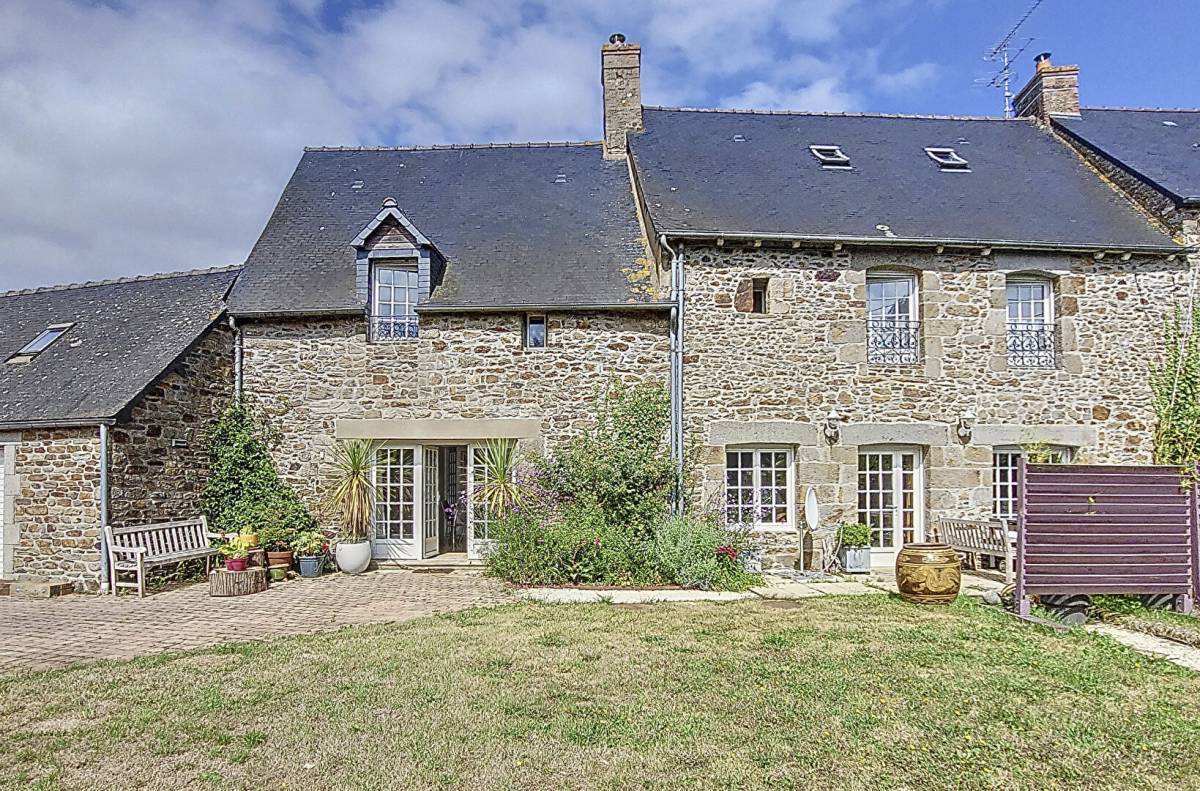 SOLE AGENCY: Located in a pretty hamlet only a stones throw from the River Rance with its delightful villages and riverside walks, a short drive to the centre of the popular village of Pleudihen sur Rance, with excellent local amenities and minutes to the main access routes to St Malo, Dinard and Rennes, this superb stone built property would make the ideal family home. The refurbished house is well designed with all the comforts of modern living yet retains some lovely original features and offers light, bright and flexible accommodation comprising on the ground floor; a delightful open plan, double aspect living room with character beams and fireplace with insert wood burner, a fitted and equipped kitchen/diner with feature fireplace with insert wood burner and utility room off, a recently re-furbished shower room and separate WC and a useful office / studio space with direct access to the enclosed and private rear garden. On the first floor there is a spacious mezzanine landing area, offering a number of possible uses, leading to 3 good sized double bedrooms, a shower room with WC and a well fitted dressing room area. The second floor provides a useful studio / workshop space which could easily be used as a fourth bedroom or be more permanently converted into a large master bedroom suite with private facilities. The house is surrounded by mature landscaped gardens enjoying the sun throughout the day and benefits from a sweeping driveway and a large double garage / workshop with rainwater storage reservoir and two small open hangars, one which would make a lovely outside eating area and one for wood storage. A really lovely property in a much sought after area. (4.00 ?es incl. VAT at the buyer's expense.)