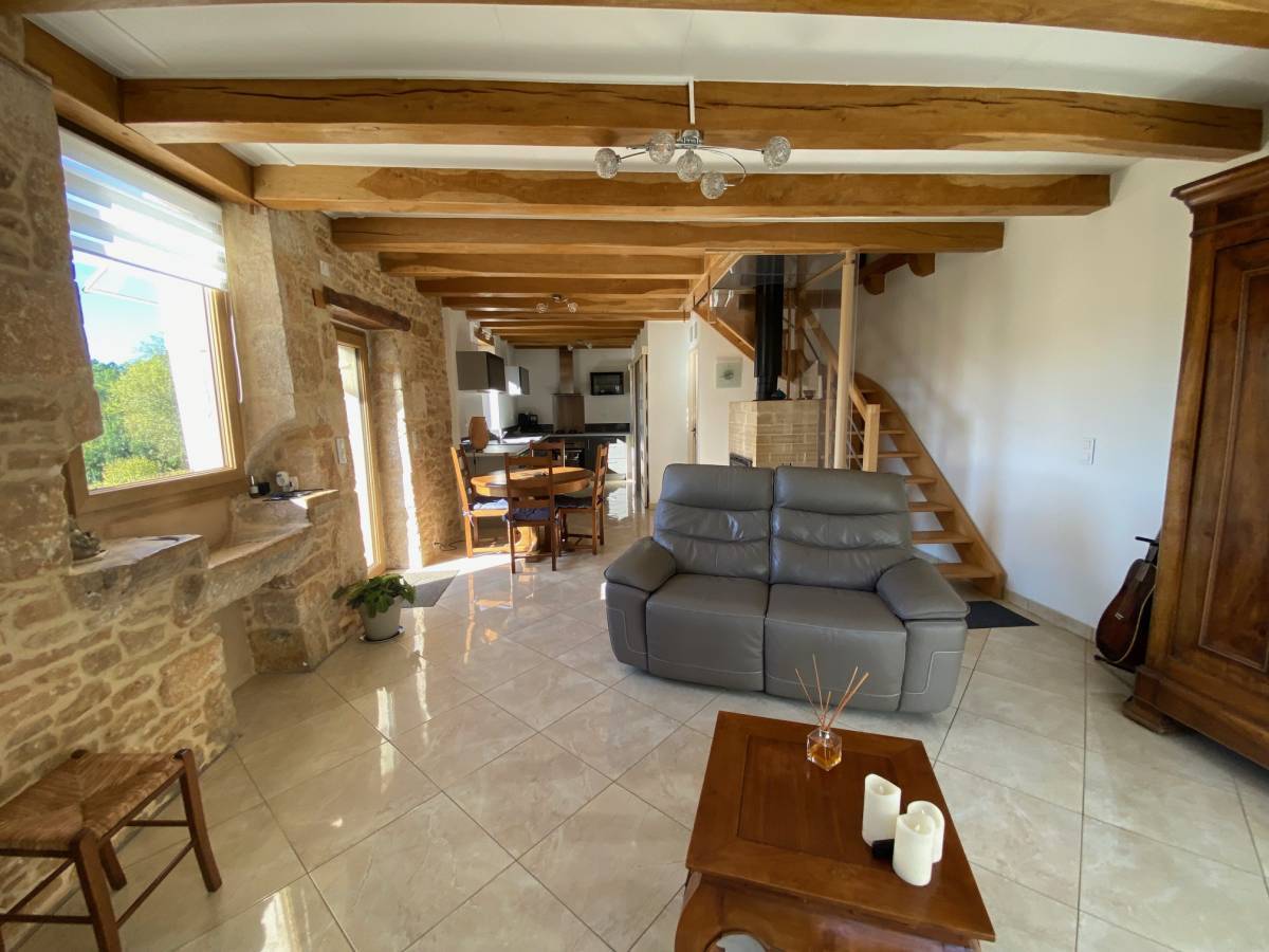 a lounge of 28. 22 m2, fireplace + stove, exposed beams, exposed stone, tiled floor.