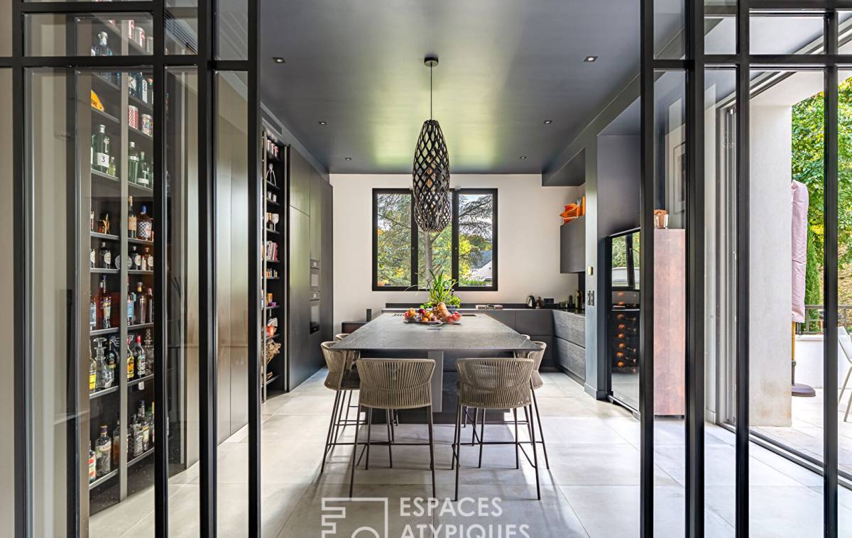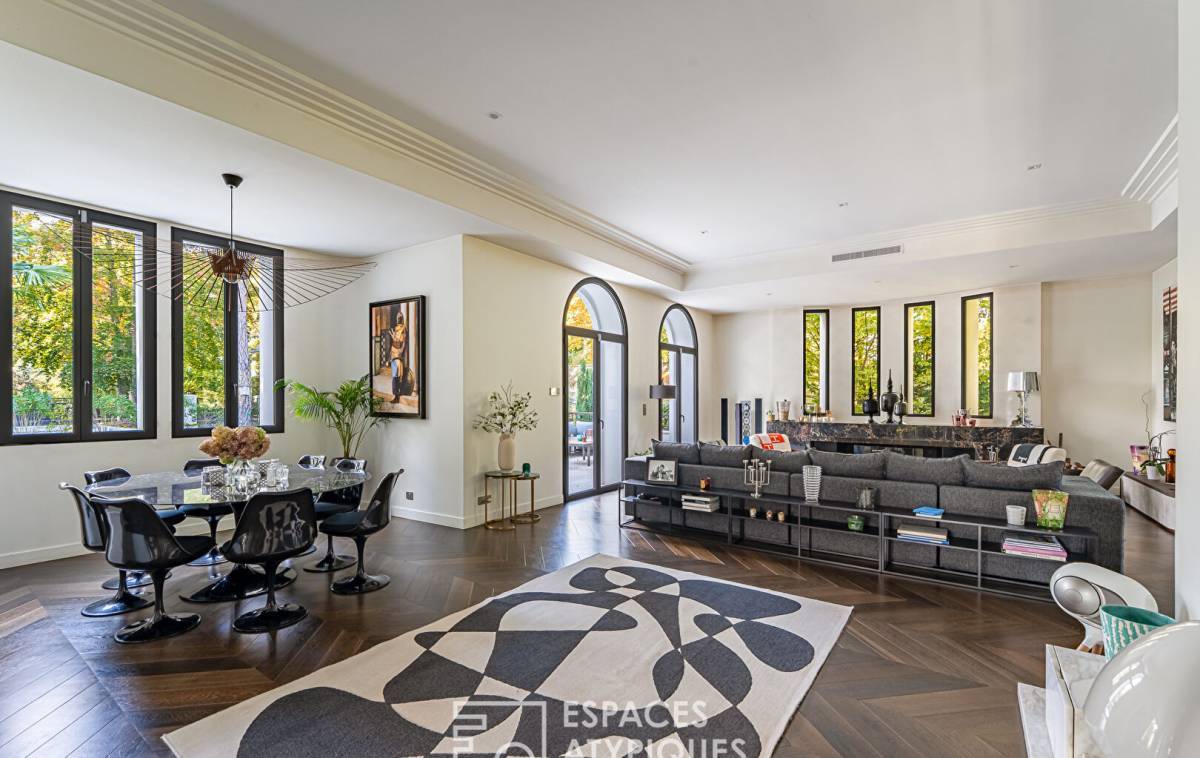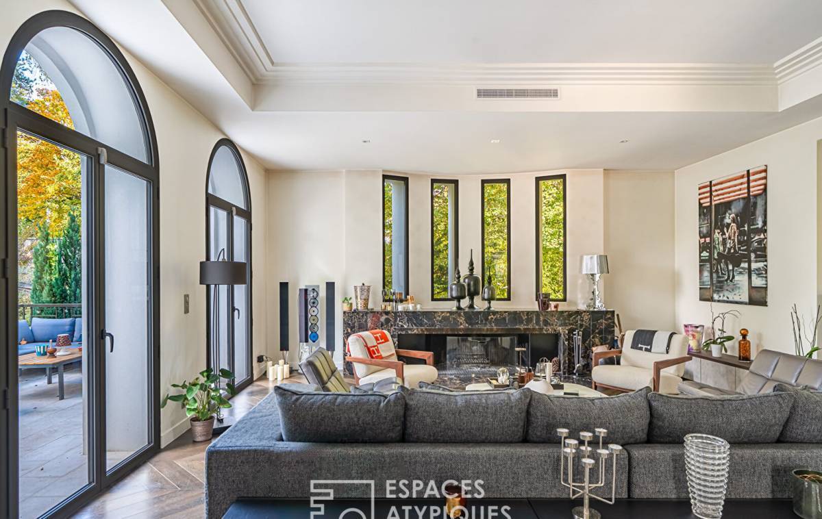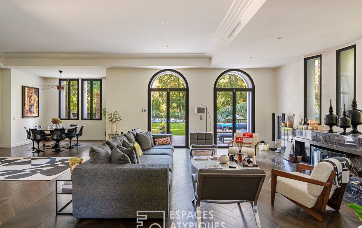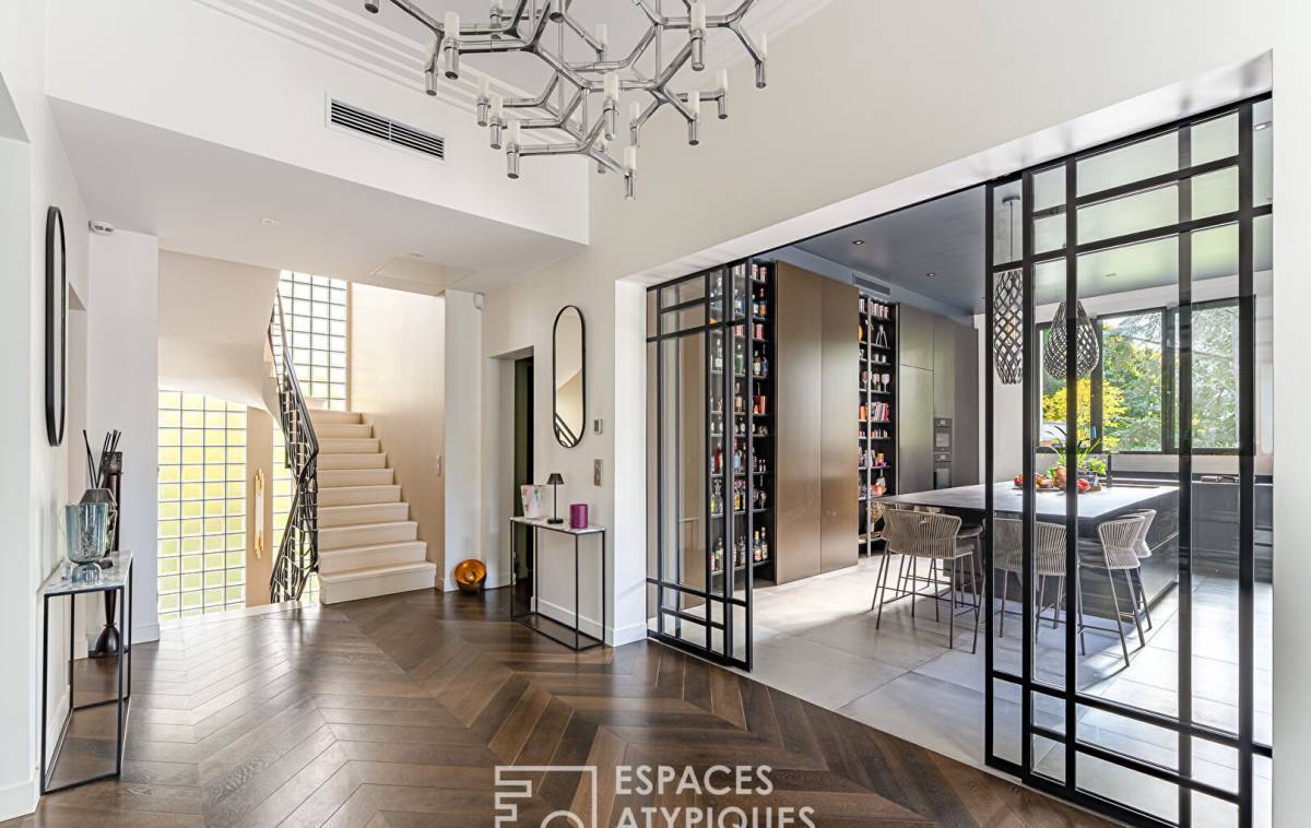 Just minutes from the center of Rueil-Malmaison, nestled in the highly sought-after Hameau de la Jonchère, a private and secure estate bordered by the Saint-Cucufa forest, this exceptional residence offers a rare living experience: that of a contemporary home where refinement blends with the serenity of nature.