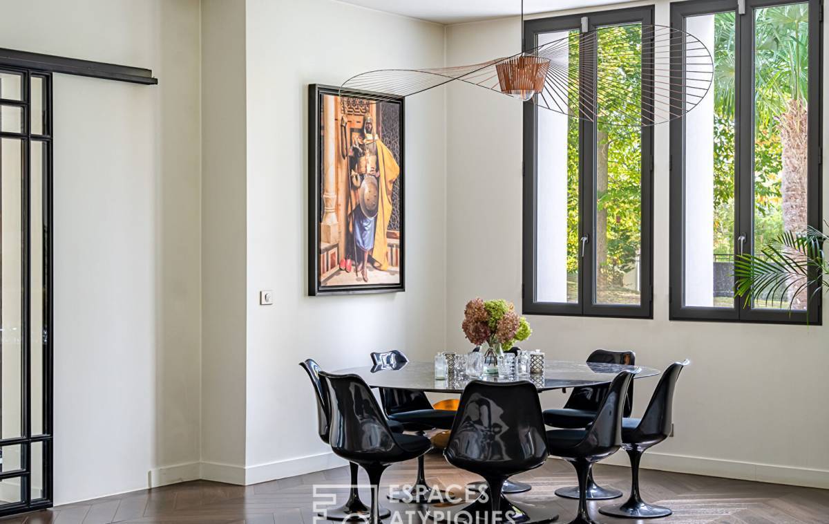 Behind its discreet gate, the house reveals itself in a refined and contemporary architecture, bathed in light. Its immaculate facades, highlighted by modern lines and generous openings, blend with a verdant garden punctuated by palm trees and mature species.