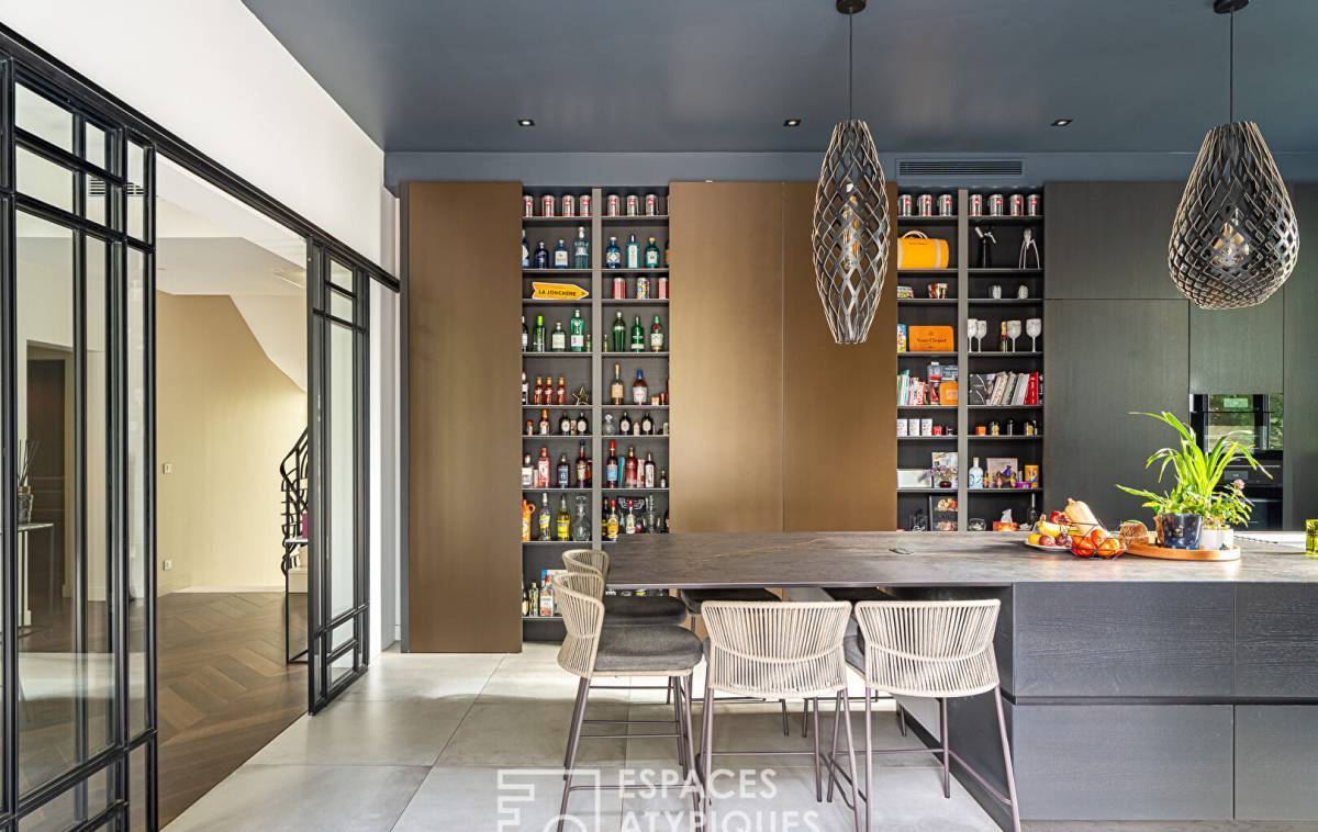The garden level, designed for well-being and conviviality, houses a gym, a cinema room, a wellness area with sauna and hammam, a swimming pool with counter-current swimming whose large bay windows open entirely onto the garden to form a single space.
