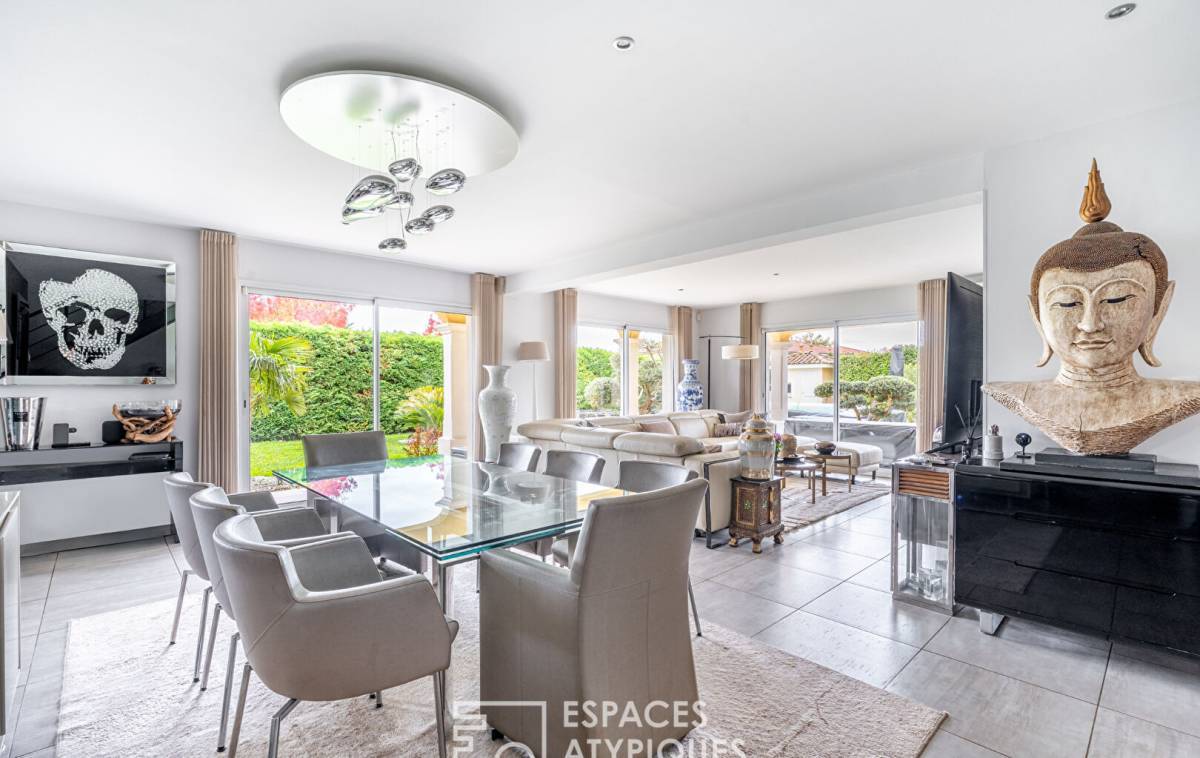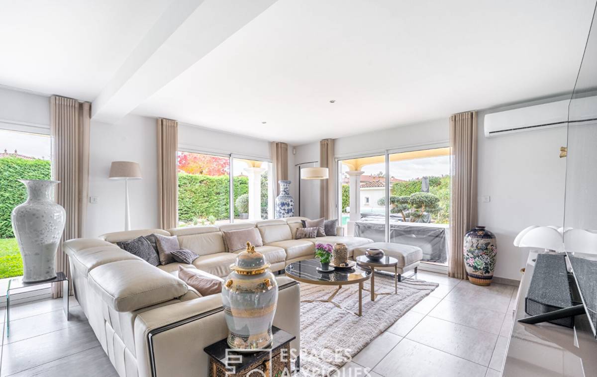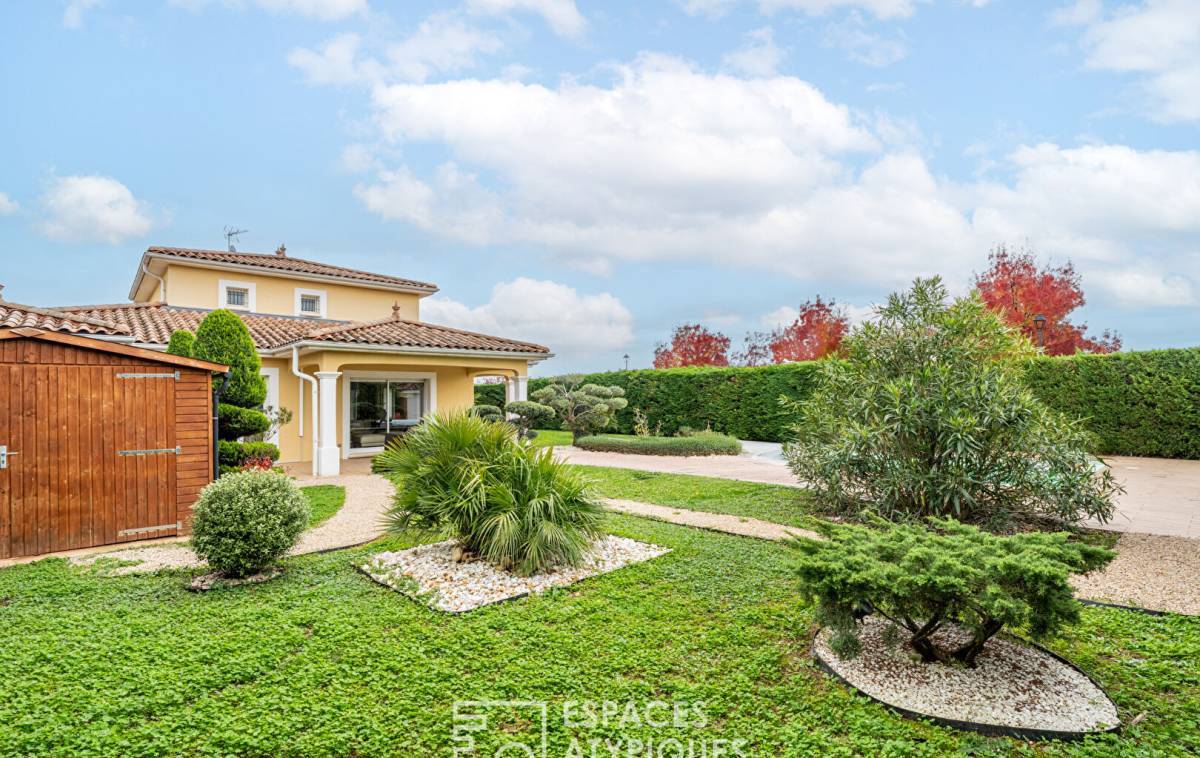 Located in a quiet, residential area in Haut-Saint-Bonnet-de-Mûre, this modern villa offers exceptional volumes and high-quality amenities. Upon entering, a spacious 80 sqm living room is characterized by its brightness thanks to numerous bay windows overlooking the garden. The garden, carefully landscaped, is completed by a salt-water swimming pool. This open-plan living room with a modern kitchen, renovated in 2021, is perfectly equipped with a functional utility room and integrated wine cellar. The single-story sleeping area houses a master suite with a double dressing room, a full bathroom, and a second bedroom. Upstairs, three additional bedrooms, all with built-in storage, as well as a shower room, complete this level. Parking is provided with a tiled double garage. The town has schools and middle schools within walking distance, various school buses for some establishments and high schools. Numerous sports and cultural associations. St Exupéry Airport and TGV train station accessible in 10 minutes. DPE: C / GES: C Estimated annual energy costs for the home between EUR1,760 and EUR2,450 per year -