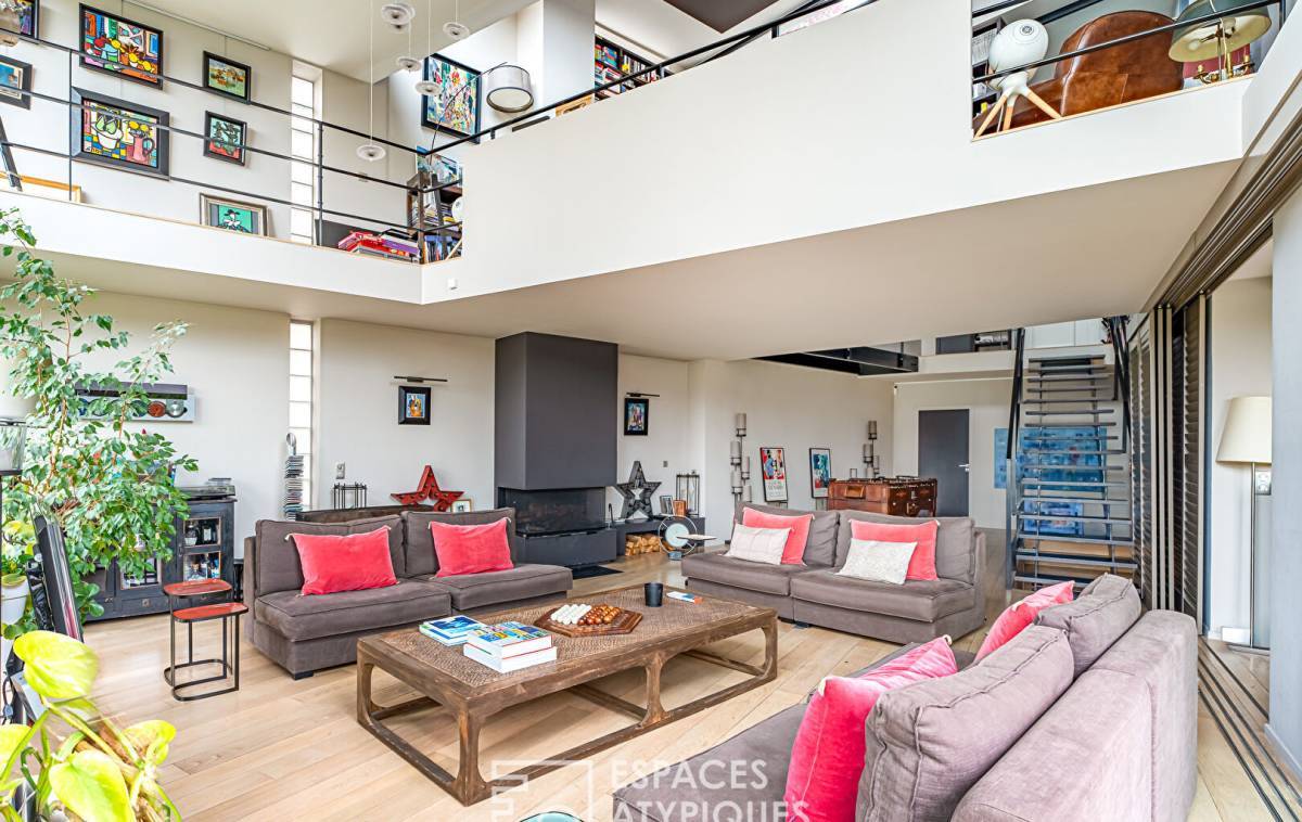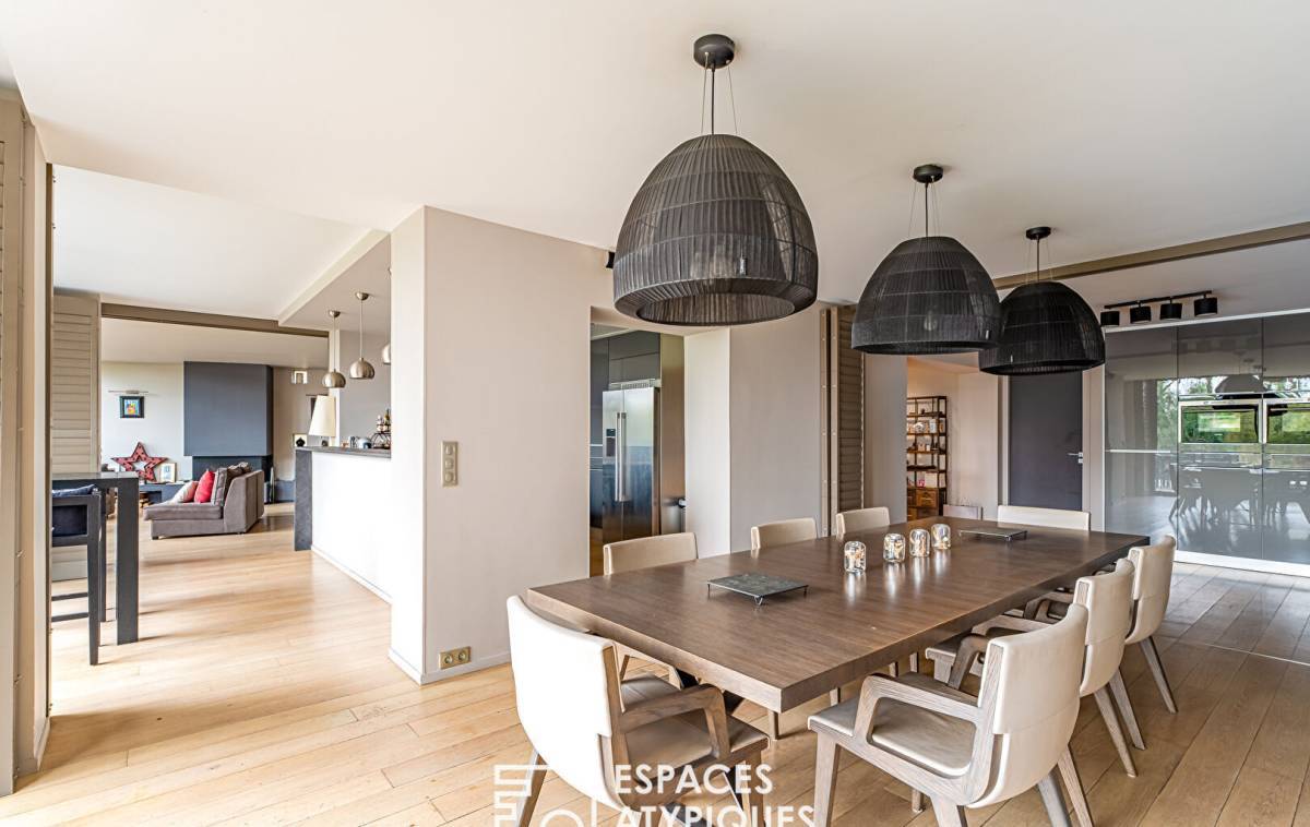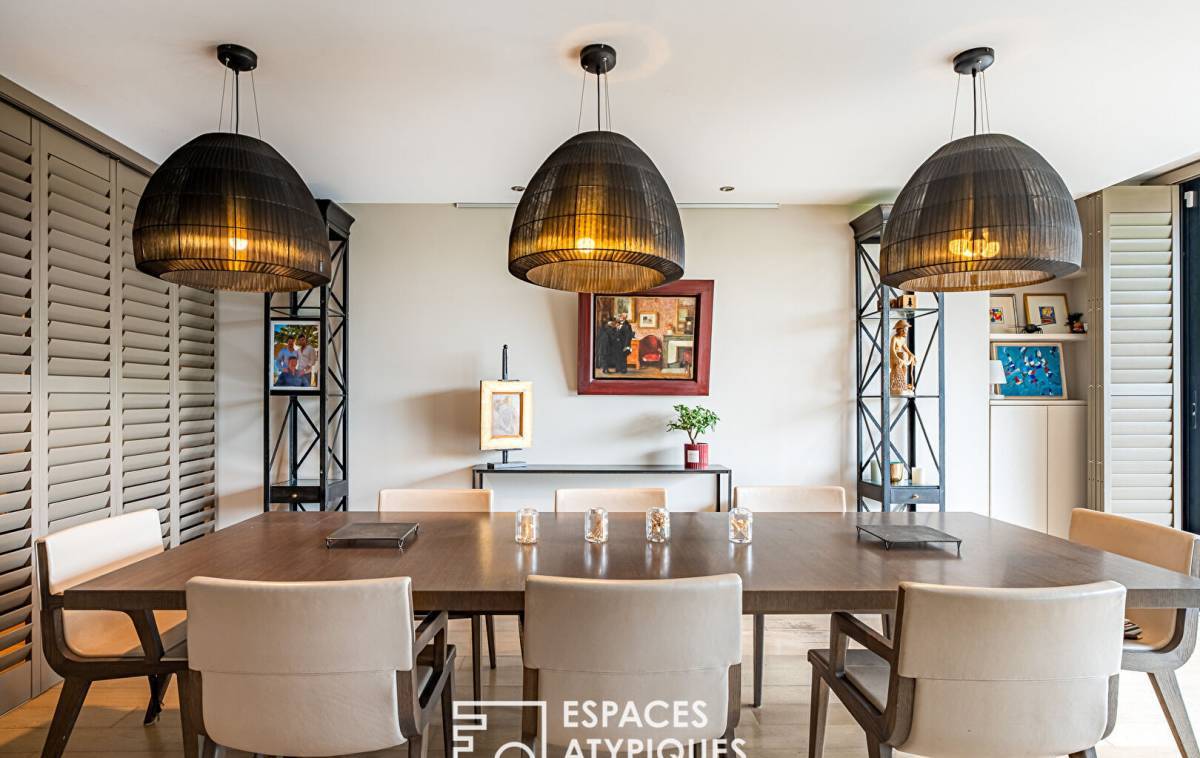 From the entrance, the tone is set with a plunging view of a reception with generous volumes, omnipresent light and optimized layout. The cathedral living room, bathed in light thanks to full-height bay windows, opens onto a huge terrace overlooking a vast terraced garden, extremely rare in this area. The fireplace and the movable partitions allow you to modulate the space according to your desires, for warm moments with family or large receptions with friends.