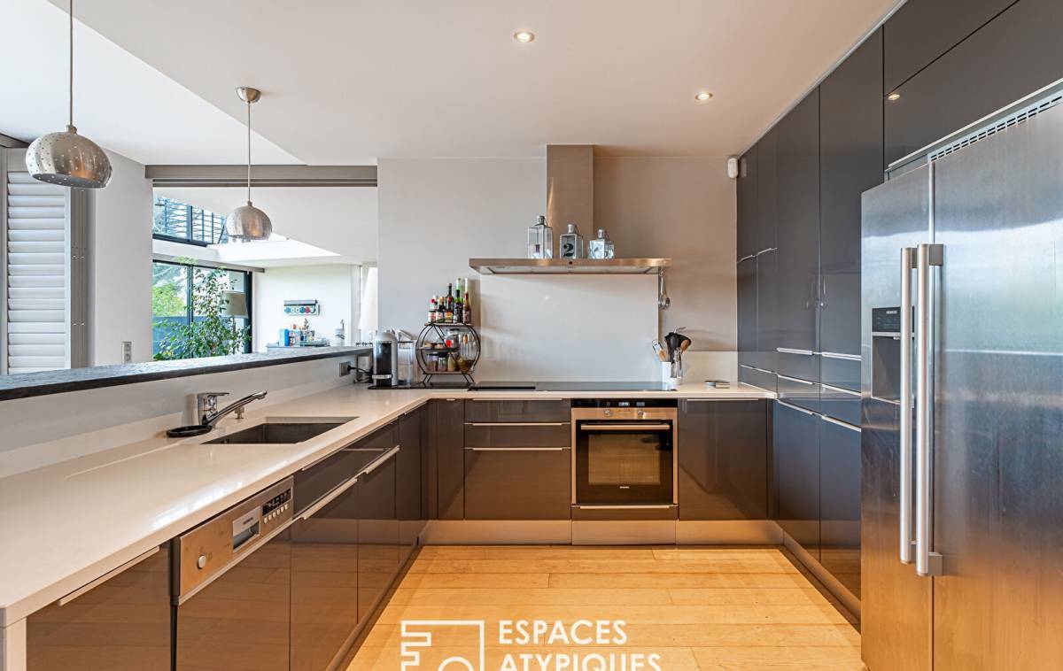 From the entrance, the tone is set with a plunging view of a reception with generous volumes, omnipresent light and optimized layout. The cathedral living room, bathed in light thanks to full-height bay windows, opens onto a huge terrace overlooking a vast terraced garden, extremely rare in this area. The fireplace and the movable partitions allow you to modulate the space according to your desires, for warm moments with family or large receptions with friends.