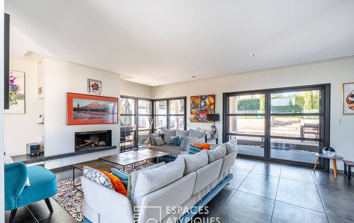 Located in the highly sought-after town of Saint Cyr au Mont d'Or, at the end of a dead-end street, this 286sqm architect-designed house with high-end features is built on a 2000sqm plot of land. The entrance provides access to a large living room of over 65sqm illuminated by its large bay windows. A library and a fully equipped kitchen with utility room complete this volume. An independent studio with kitchenette, shower room and bedroom can also be accessed on this level. The upper floor serves two bedrooms with access to a large terrace, a shower room and a large master suite with bathroom and dressing room. The house has a full basement of 120sqm including an office, a wine cellar, a storage space and the technical room. The garden has a major and rare asset: a heated swimming lane of 20m x 4. Numerous terraces and pergolas enhance the whole to enjoy the beautiful summer days. The quality of construction, the location, the calm, the landscaped garden as well as the swimming lane make this house a unique place. ENERGY CLASS: B / CLIMATE CLASS: A Estimated average amount of annual energy expenditure for standard use, established from the energy prices of the year 2023: between 1390 and 1970 EUR