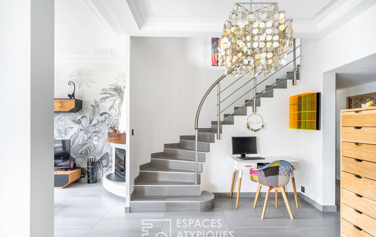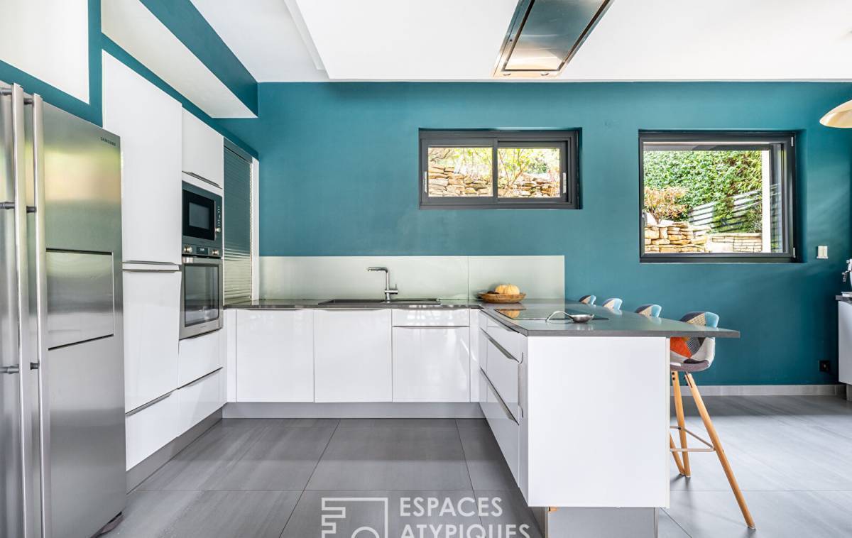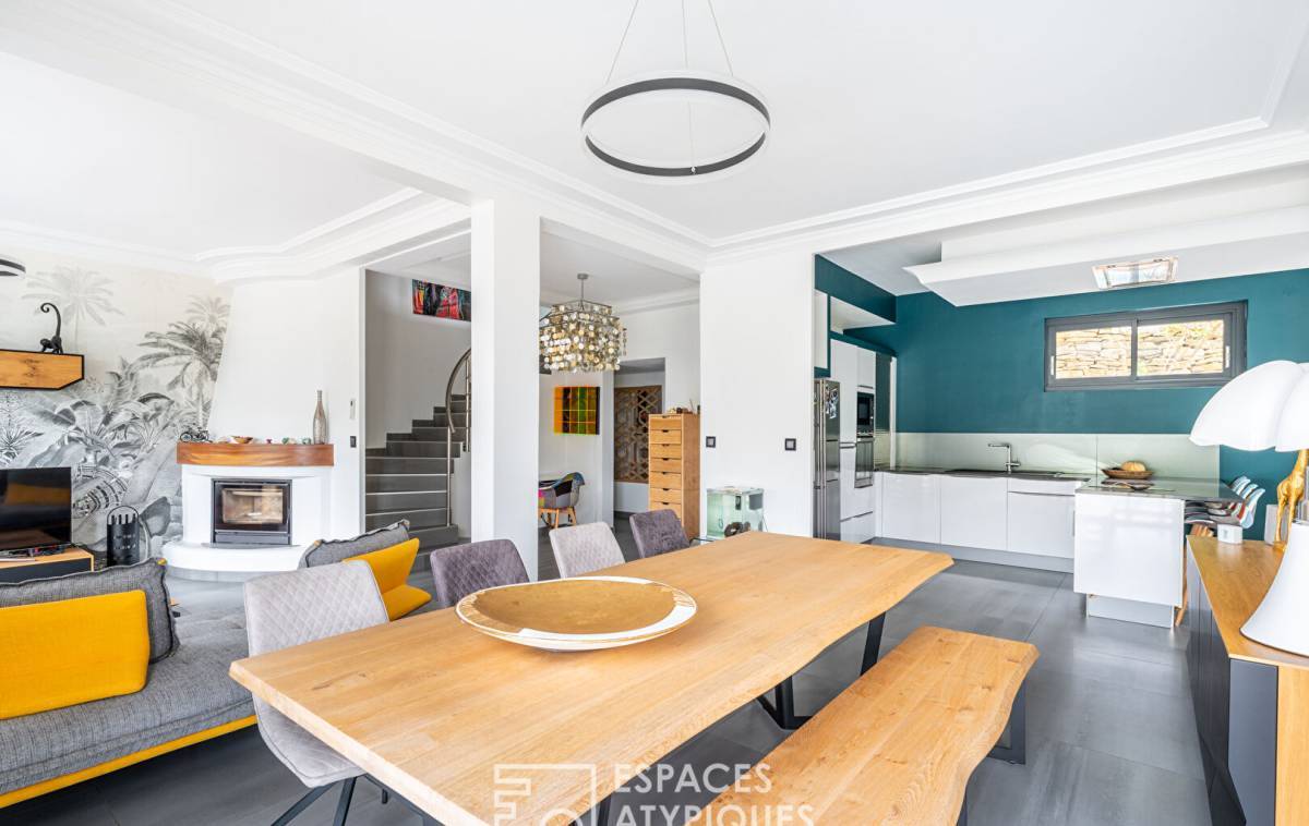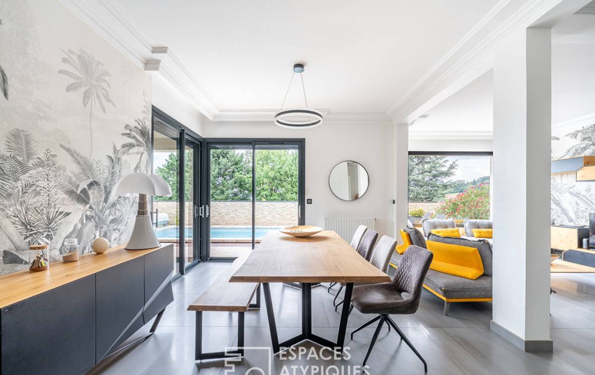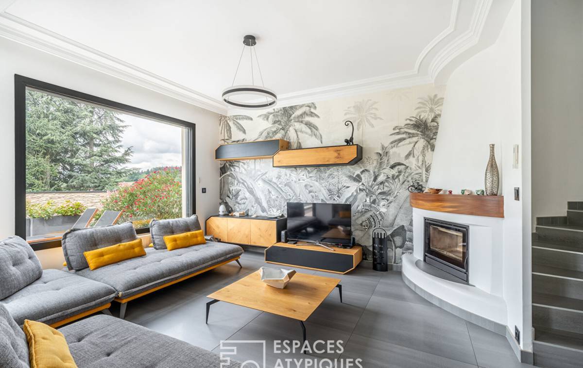 On the sought-after hills of Saint-Cyr-au-Mont-d'Or, in the heart of a green and private environment, this 200sqm family home offers an exceptional living environment. Completely renovated with high-end materials, it consists of a bright living room with fireplace, an open-plan equipped kitchen with dining area, four large bedrooms including a master suite with private bathroom, as well as a separate studio with kitchenette and bathroom, ideal for entertaining or for a professional or Airbnb activity. Arranged on two levels, the house offers bright and functional living spaces, enhanced by large bay windows facing southwest.
