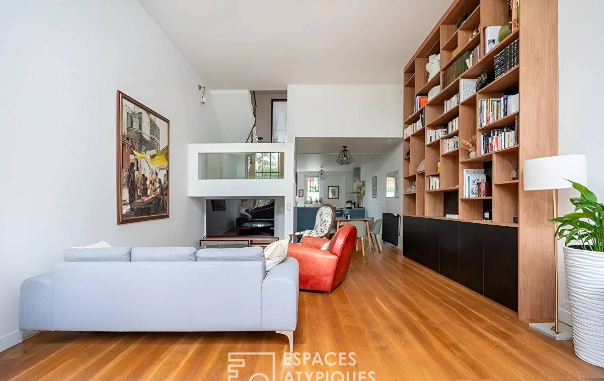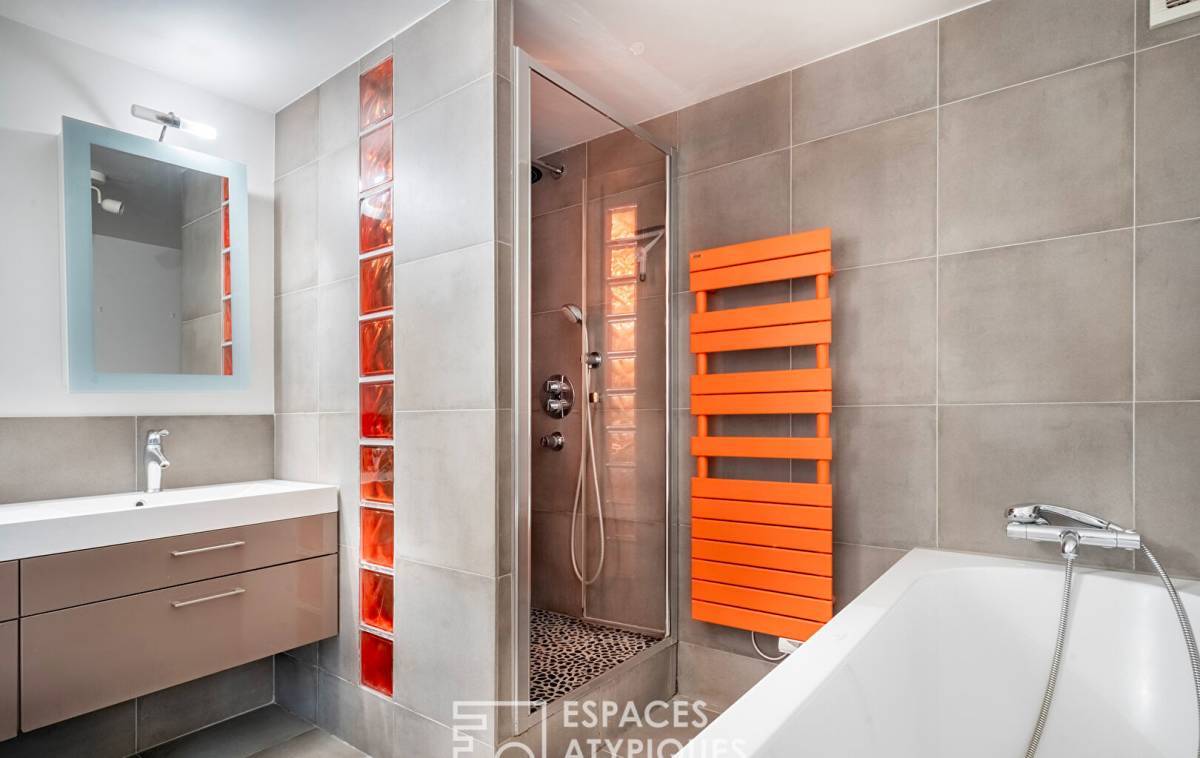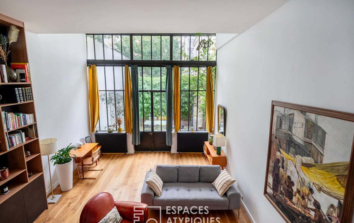 Located in the city center of Saint-Denis, between Rue des Ursulines and Rue de la République, this former workshop converted into a loft offers 128 sqm of living space (110.01 sqm Carrez), extended by a 17 sqm landscaped terrace. Hidden behind a discreet porch and sheltered within a cobbled courtyard, this confidential haven perfectly blends the artisanal soul of yesterday with today's contemporary architecture.