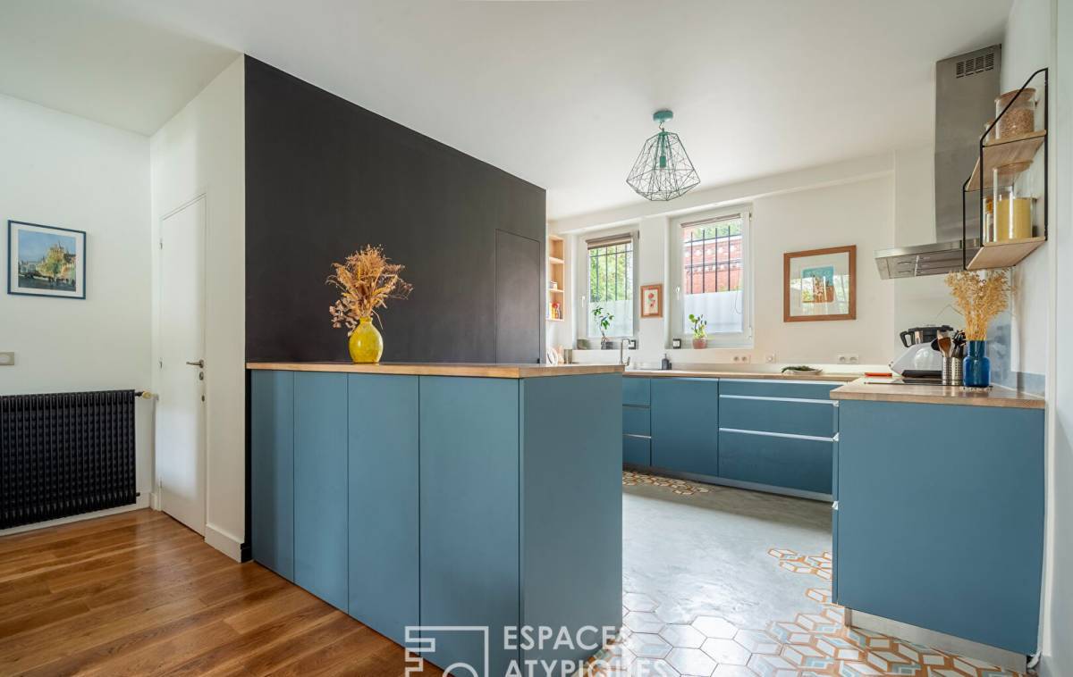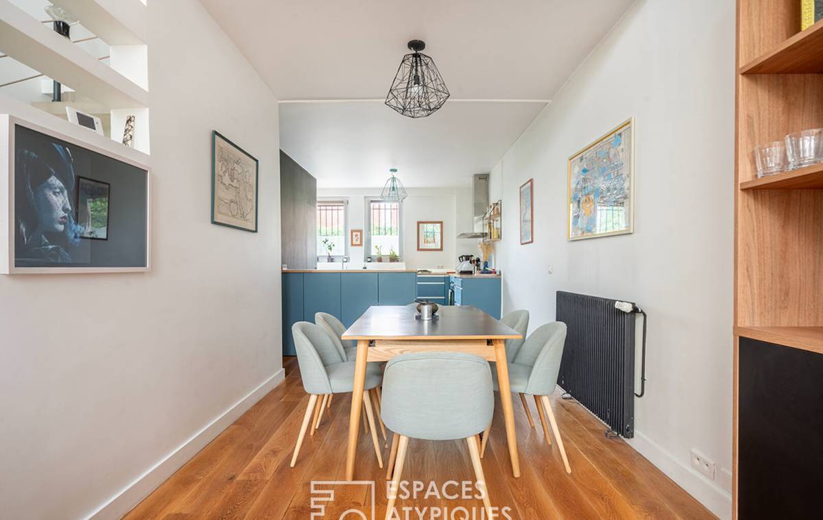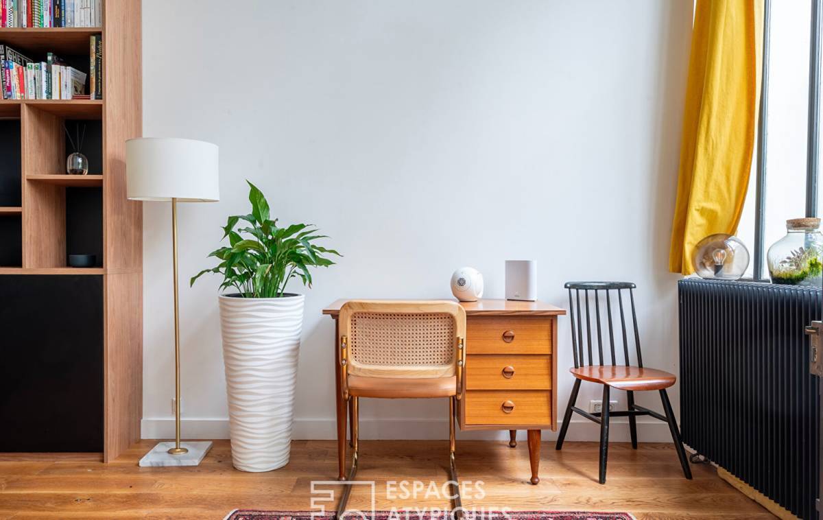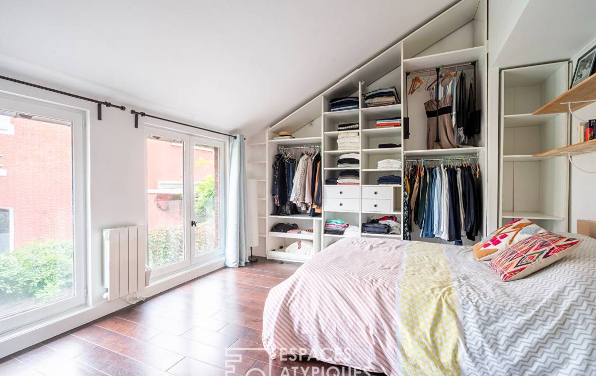 Located in the city center of Saint-Denis, between Rue des Ursulines and Rue de la République, this former workshop converted into a loft offers 128 sqm of living space (110.01 sqm Carrez), extended by a 17 sqm landscaped terrace. Hidden behind a discreet porch and sheltered within a cobbled courtyard, this confidential haven perfectly blends the artisanal soul of yesterday with today's contemporary architecture.