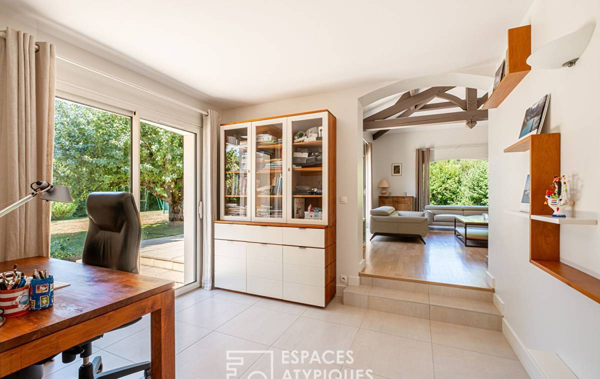 The main level is organized around a hall leading to the various spaces. To the south, flooded with natural light, is a modern and spacious kitchen, extended by a dining room, an office space, and a living room with a cathedral ceiling.