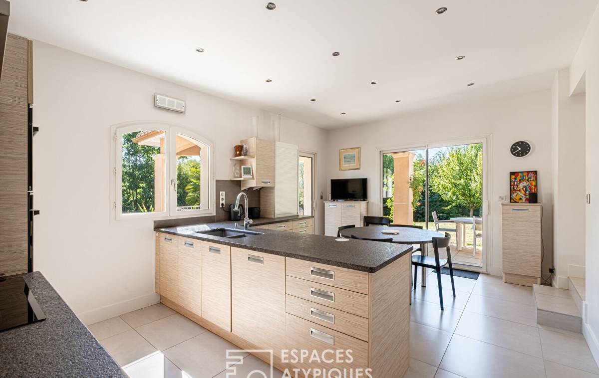 The main level is organized around a hall leading to the various spaces. To the south, flooded with natural light, is a modern and spacious kitchen, extended by a dining room, an office space, and a living room with a cathedral ceiling.