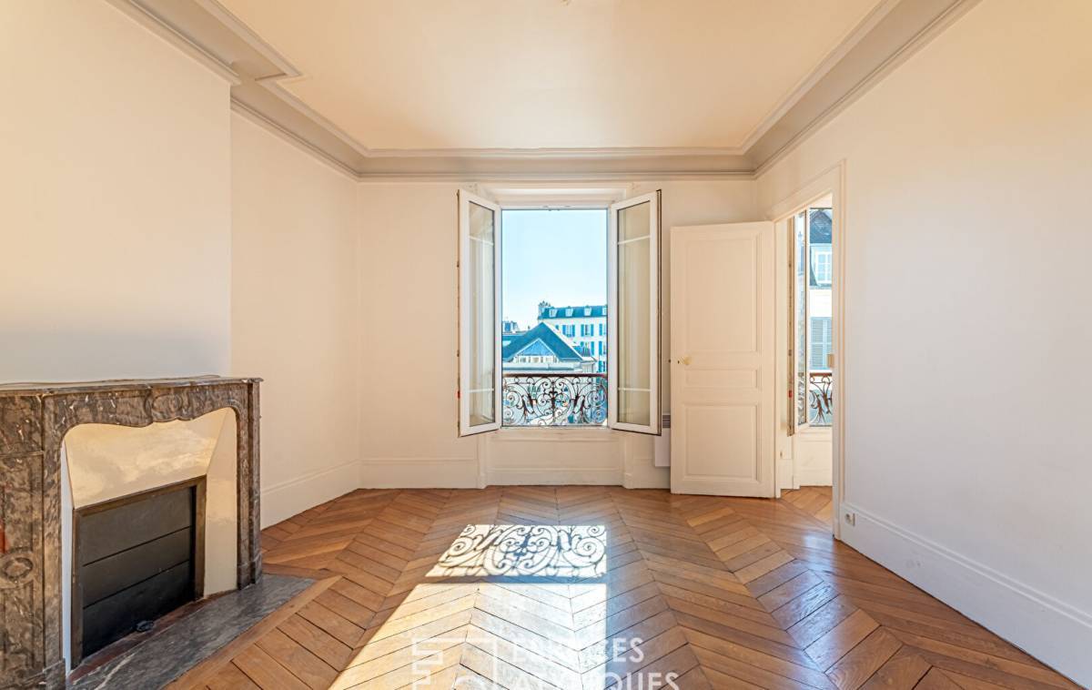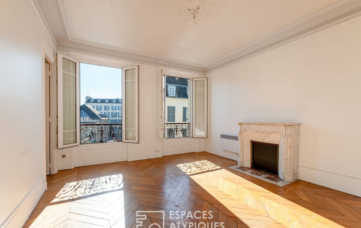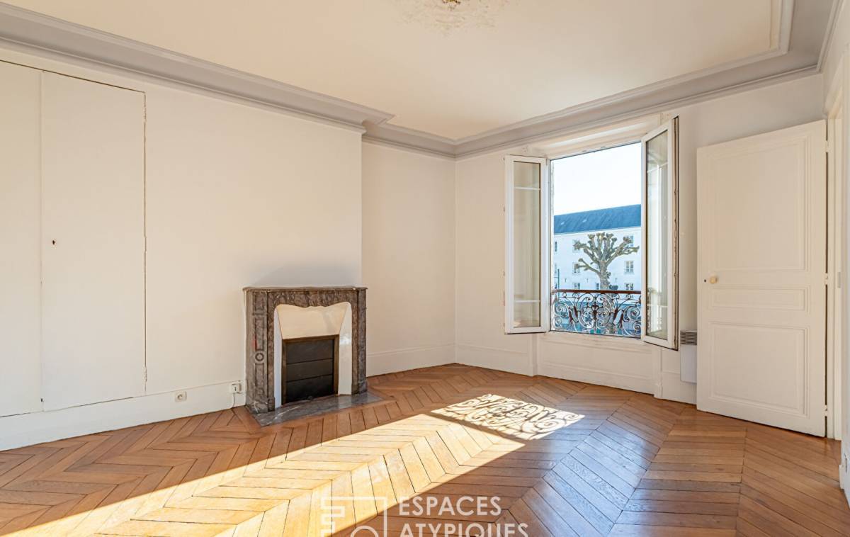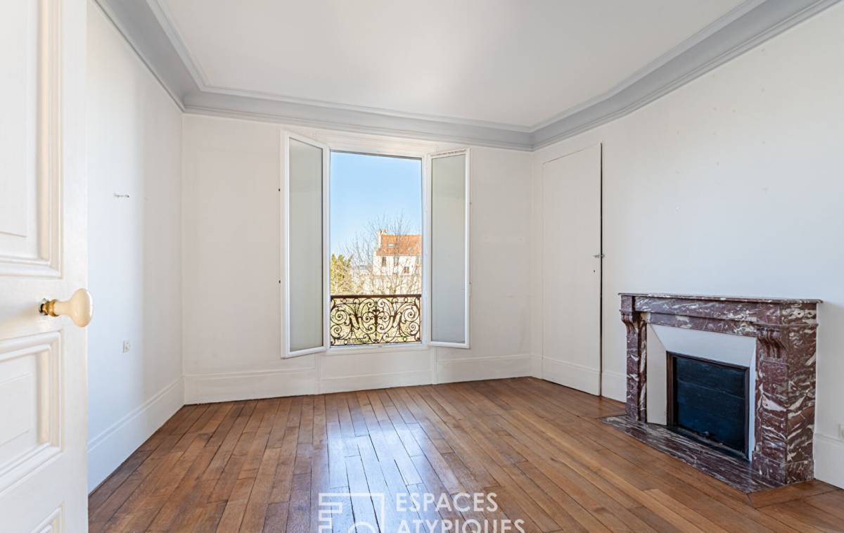 This bright apartment is located on the first floor of an old building on the Saint Germain en Laye plateau, just 8 minutes walk from the RER A, and 5 minutes from the market square. The entrance opens onto a hallway which leads to a pleasant 18 sqm living room with old Hungarian parquet flooring, a marble fireplace, and a high ceiling decorated with moldings and rose windows. The 14 sqm master bedroom with its storage cupboard and balcony shares a bathroom with the second 12 sqm bedroom facing the gardens. The fitted kitchen benefits from a laundry room. A 2.20 sqm cellar completes the services of this accommodation. A common garden is available to co-owners, to enjoy a green space in the heart of the city. RER A, Tram 13, 8 min walk, ENERGY CLASS: E / CLIMATE CLASS: E. Estimated average amount of annual energy expenditure for standard use, established based on energy prices for the year 2021: between EUR1,050 and EUR1,470