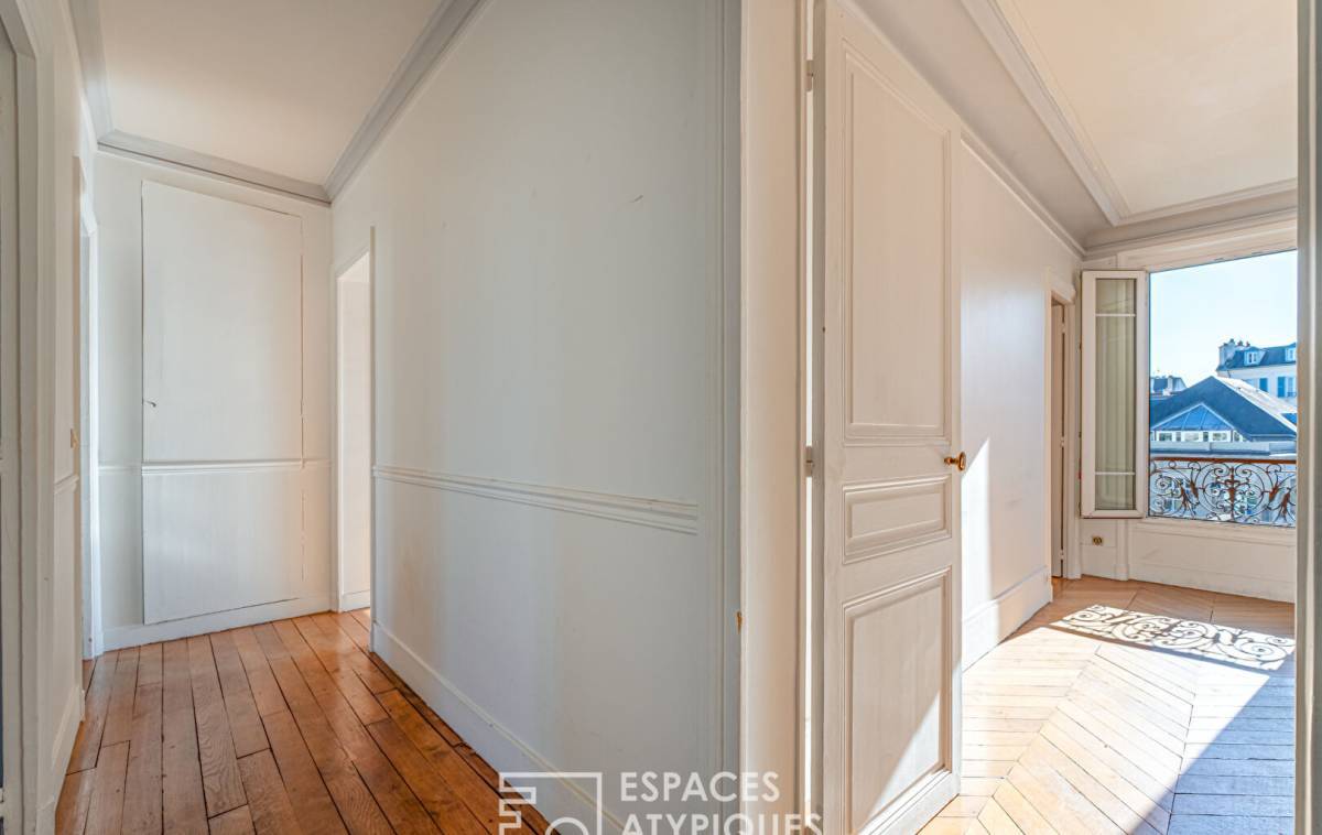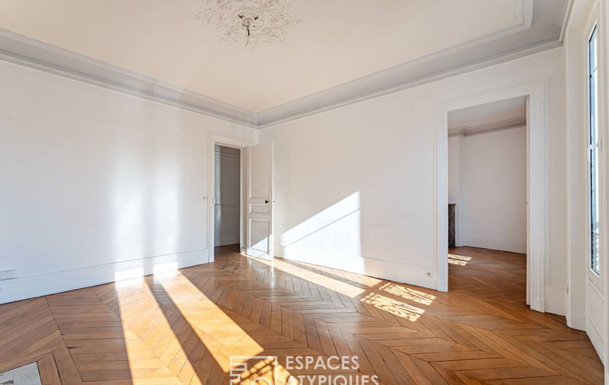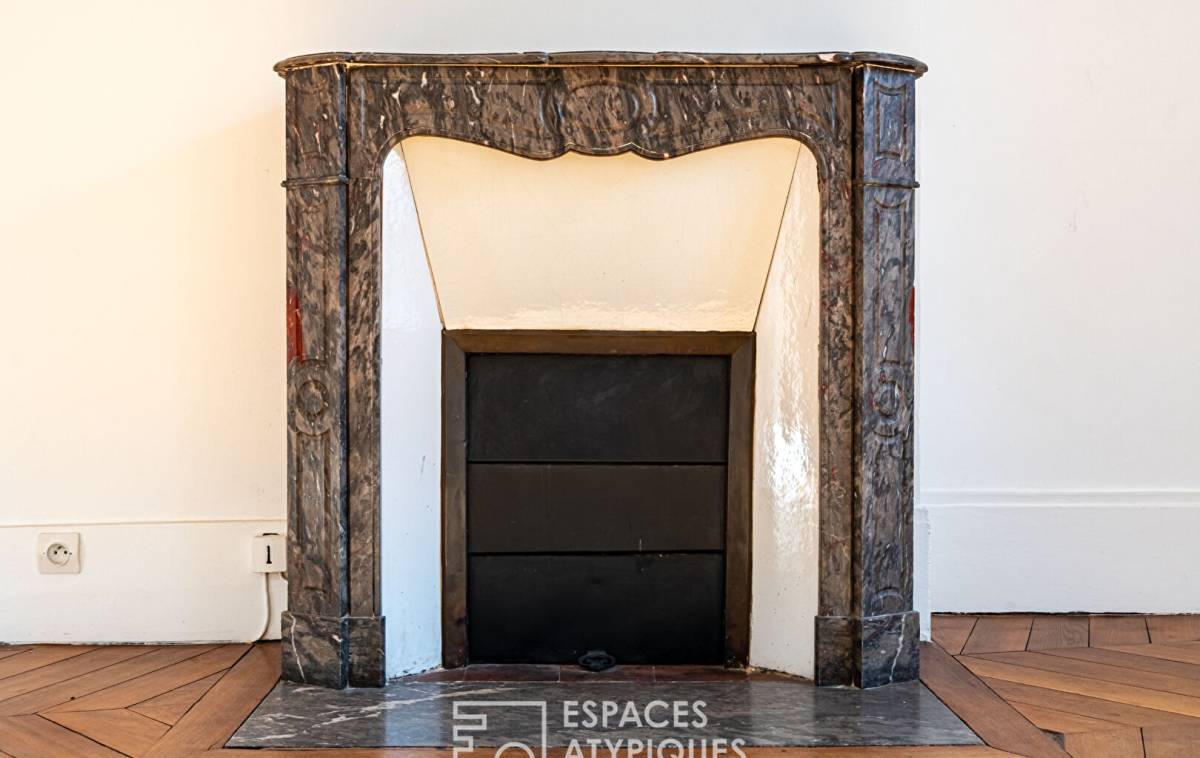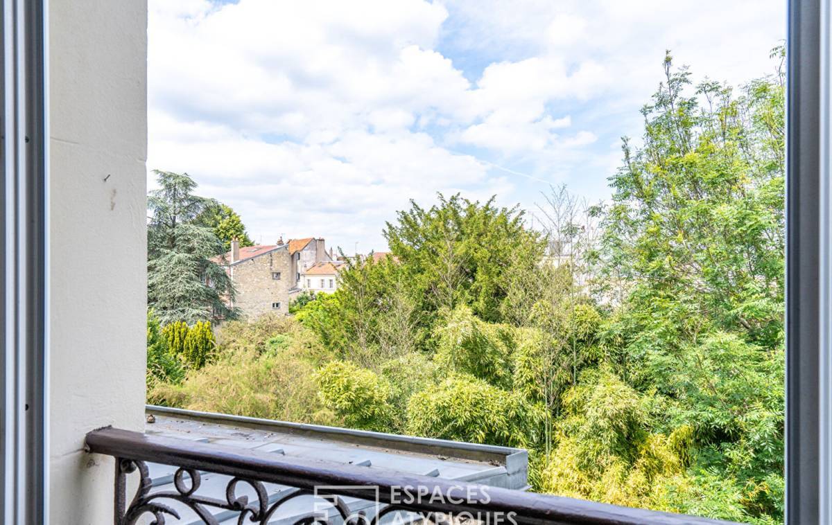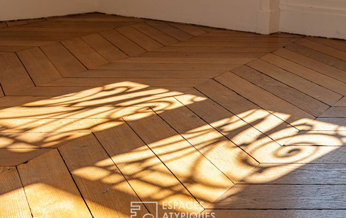 This bright apartment is located on the first floor of an old building on the Saint Germain en Laye plateau, just 8 minutes walk from the RER A, and 5 minutes from the market square. The entrance opens onto a hallway which leads to a pleasant 18 sqm living room with old Hungarian parquet flooring, a marble fireplace, and a high ceiling decorated with moldings and rose windows. The 14 sqm master bedroom with its storage cupboard and balcony shares a bathroom with the second 12 sqm bedroom facing the gardens. The fitted kitchen benefits from a laundry room. A 2.20 sqm cellar completes the services of this accommodation. A common garden is available to co-owners, to enjoy a green space in the heart of the city. RER A, Tram 13, 8 min walk, ENERGY CLASS: E / CLIMATE CLASS: E. Estimated average amount of annual energy expenditure for standard use, established based on energy prices for the year 2021: between EUR1,050 and EUR1,470