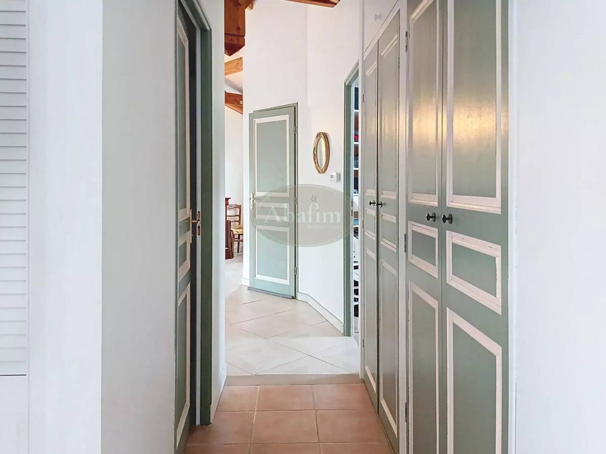 From the entrance hall, on the left, a corridor with cupboards leads to the two bedrooms (12 m² each), a small study (5 m²), the shower room (5.5 m²) and the toilet.