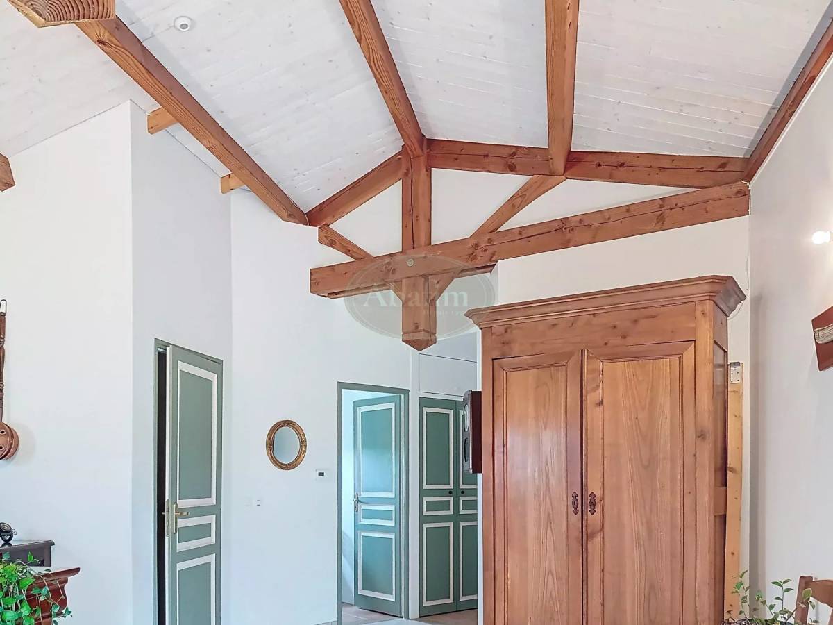 The entrance hall (6 m²) gives access to a large living area (24 m²) overlooked by the exposed wooden framework, with a view of the garden through the large picture windows.