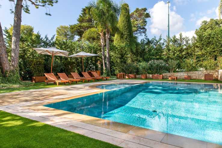 Wonderful property in perfect condition near the Grand Hotel in calm location offering flat gardens with swimming pool. This recently renovated villa is arranged over three levels and composed of; an entrance hall, spacious living and dining room open onto a covered terrace and the garden, independent fitted kitchen, six bedrooms with access to large terraces, dressing rooms, five bathrooms, an independent apartment for personnel, laundry room, wine cellar. Garage, parking for several cars.