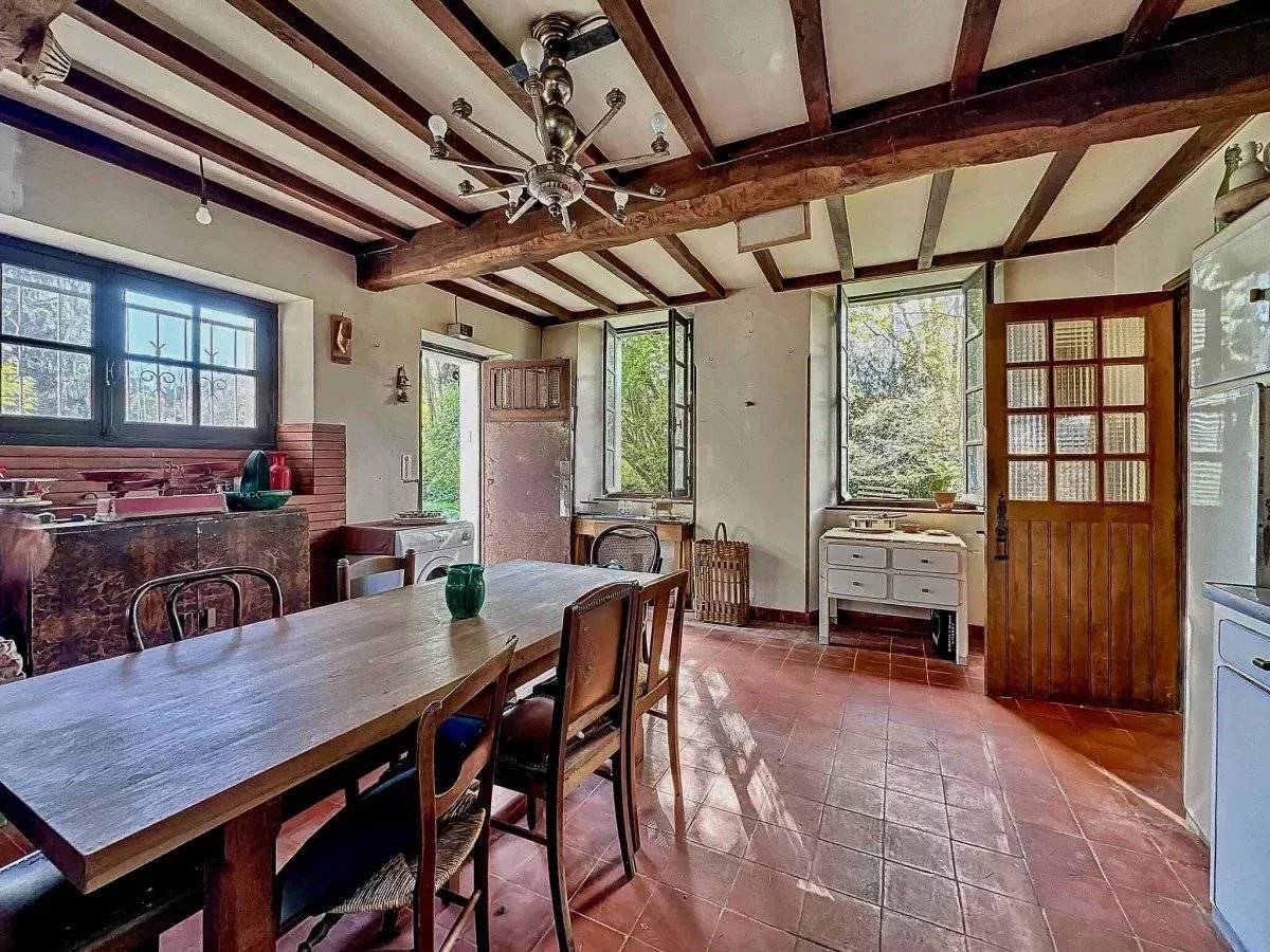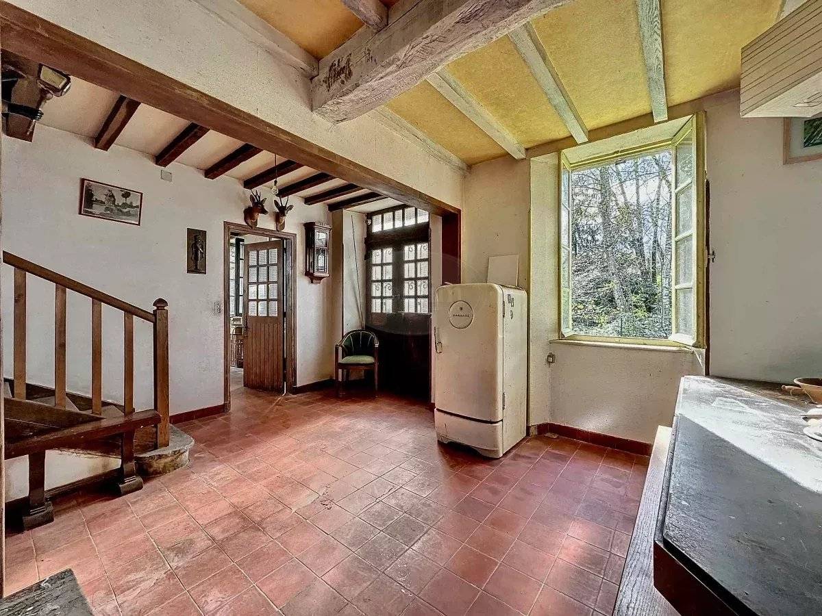 The entrance hall gives onto a big living room (40 m²) with an imposing fireplace. To the right of the entrance hall is the kitchen (25 m²) with a door that opens onto a small terrace that faes due south.