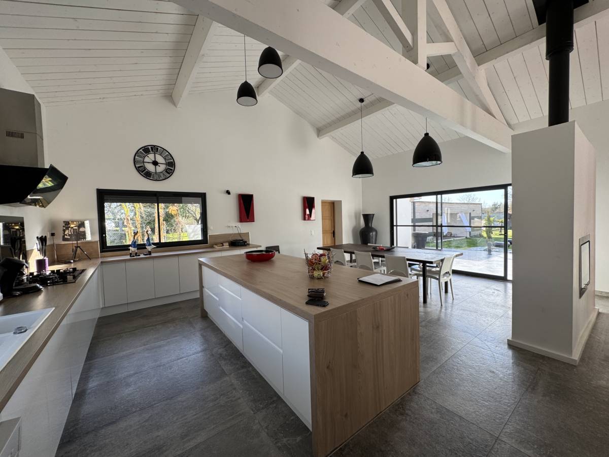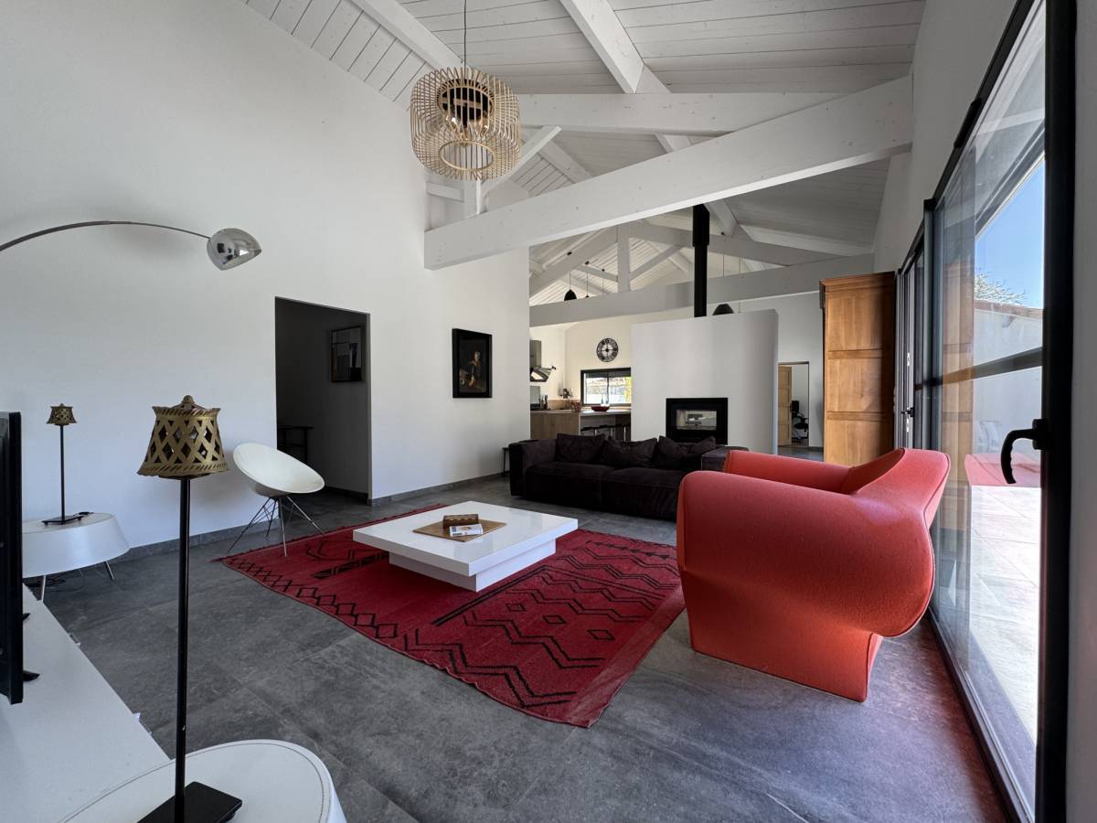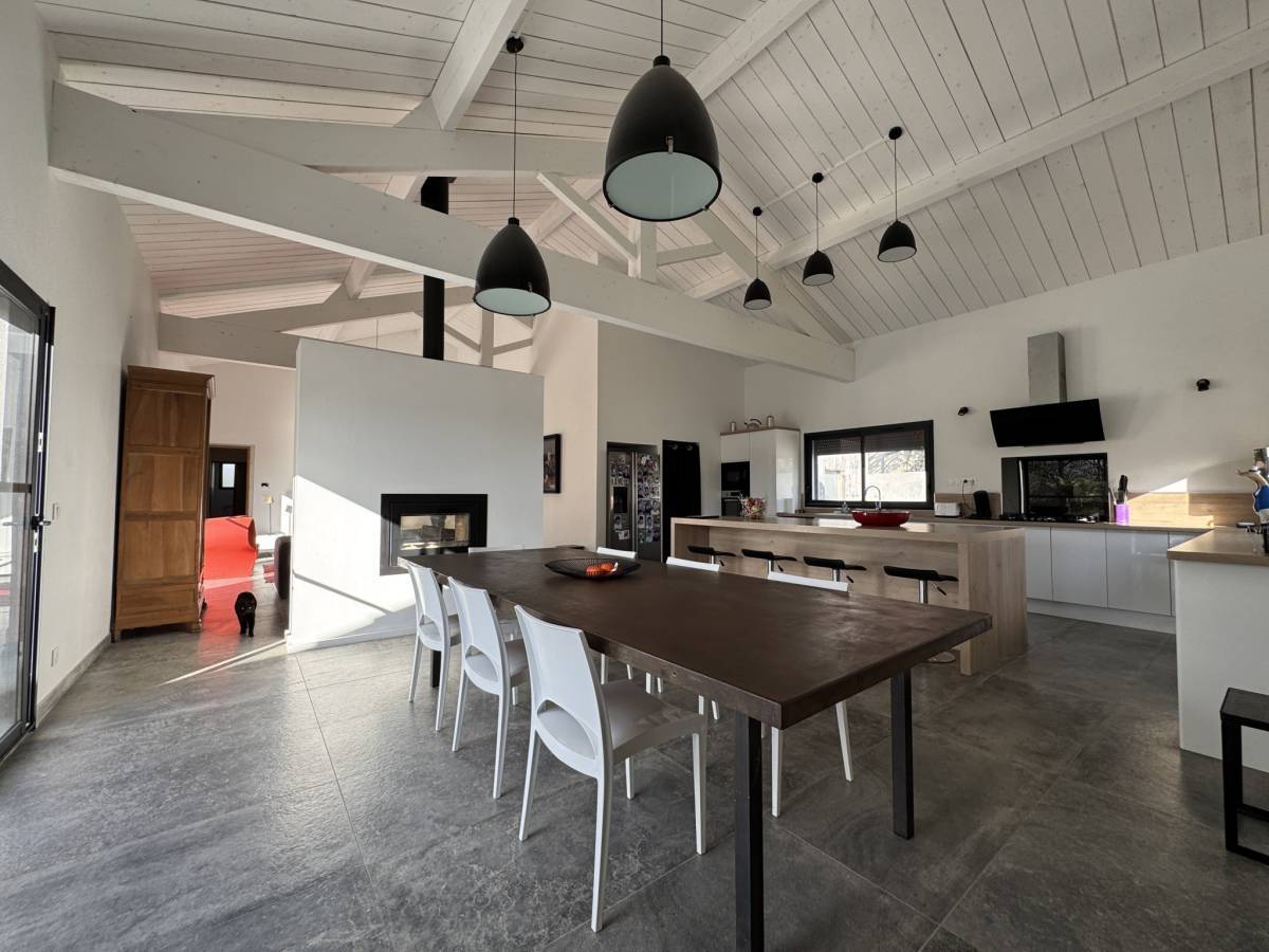 The modern central fireplace is impressive A true centerpiece, it connects the living room and the open kitchen. It complements the underfloor heating by a heat pump. One wing on the kitchen side offers a separate and intimate bedroom suite.