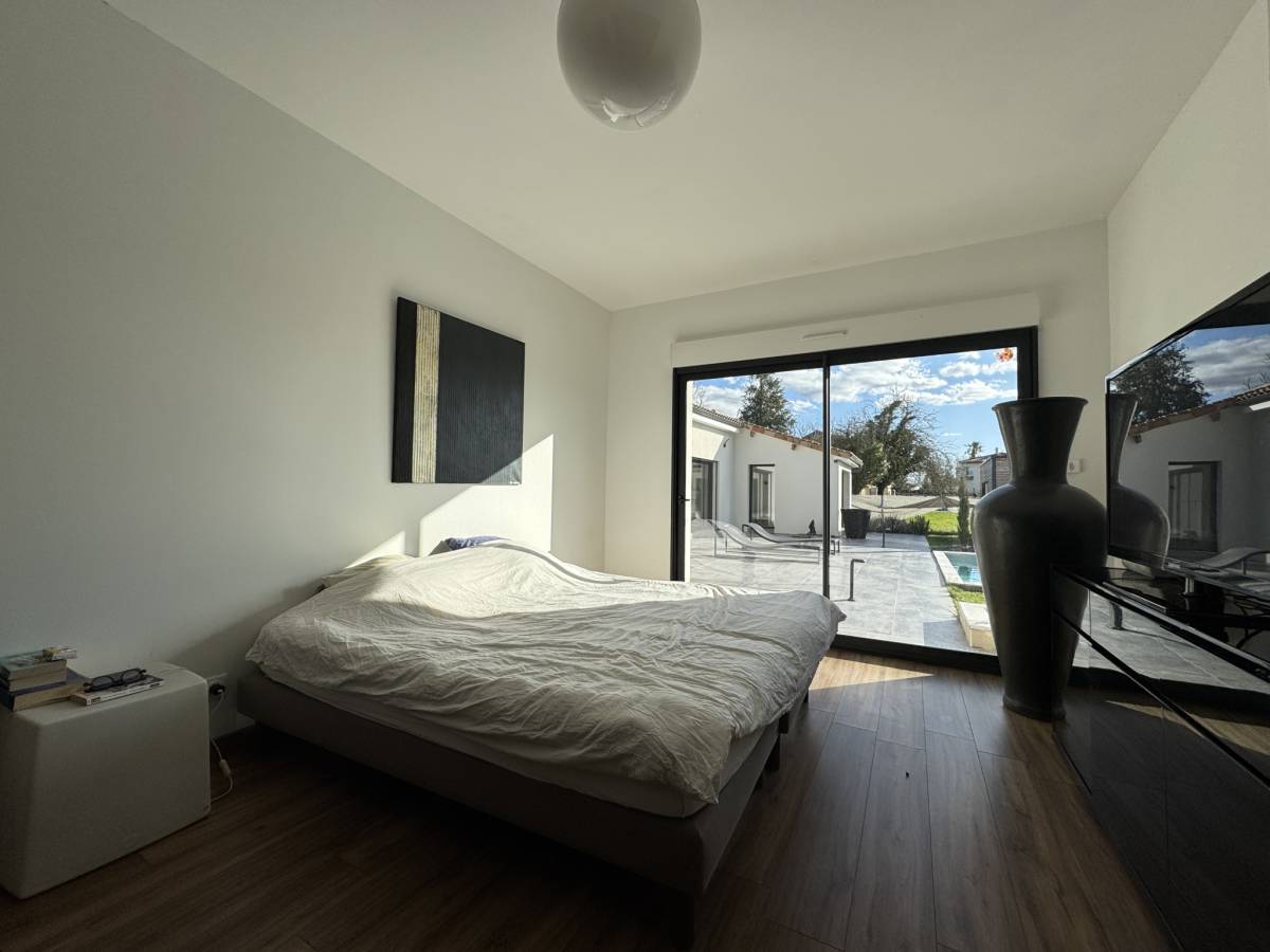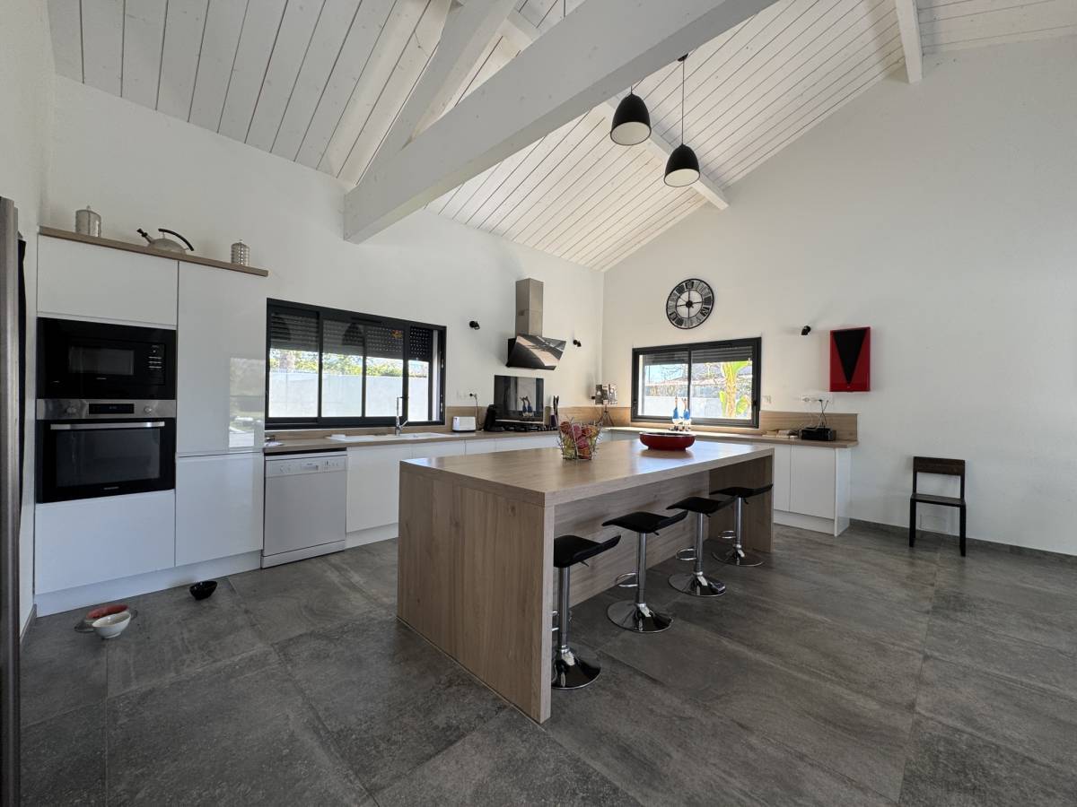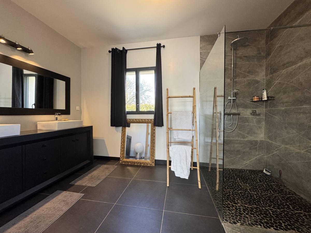 The modern central fireplace is impressive A true centerpiece, it connects the living room and the open kitchen. It complements the underfloor heating by a heat pump. One wing on the kitchen side offers a separate and intimate bedroom suite.