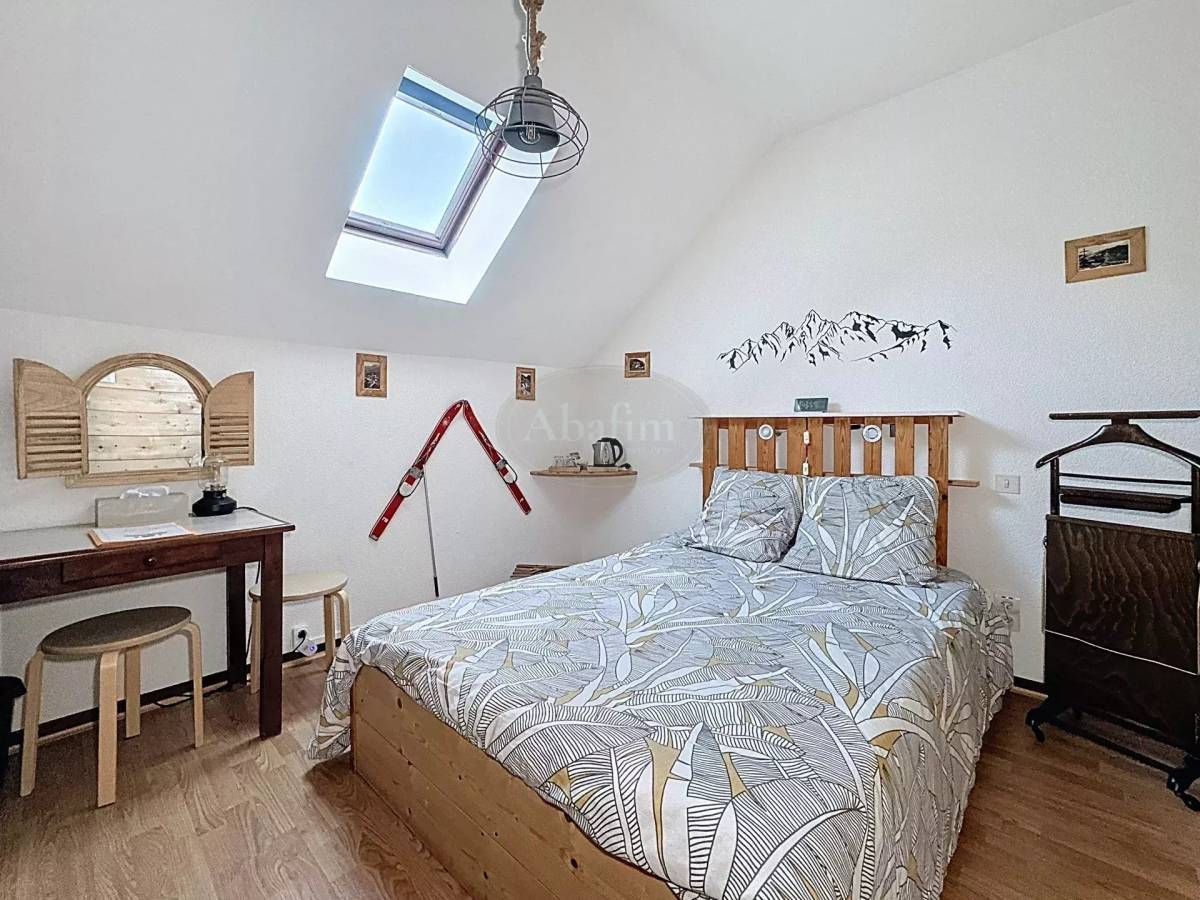On the ground floor, after passing through the entrance door of the private section, you will find a large, very functional kitchen extending into a living room opening onto a terrace with a beautiful view of the surrounding mountains. To the right of the entrance, a hallway leads to two bedrooms and a bathroom.