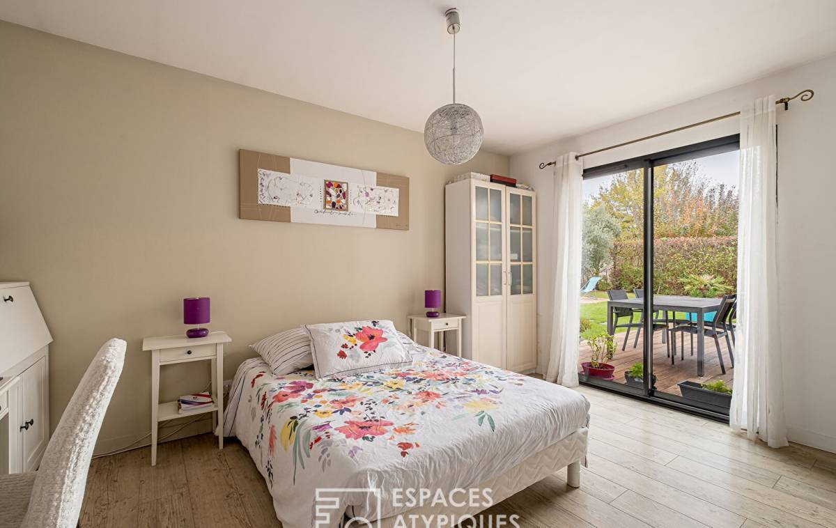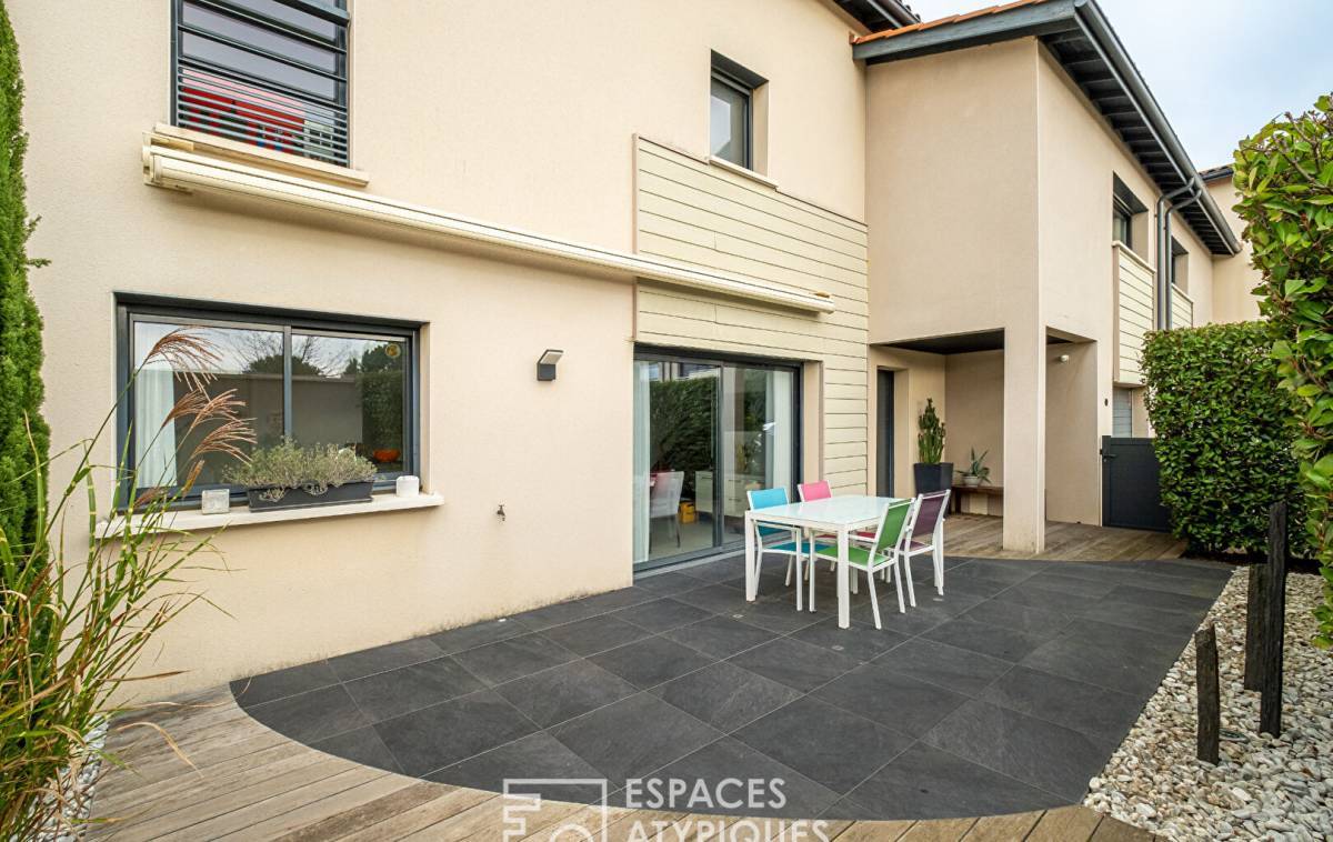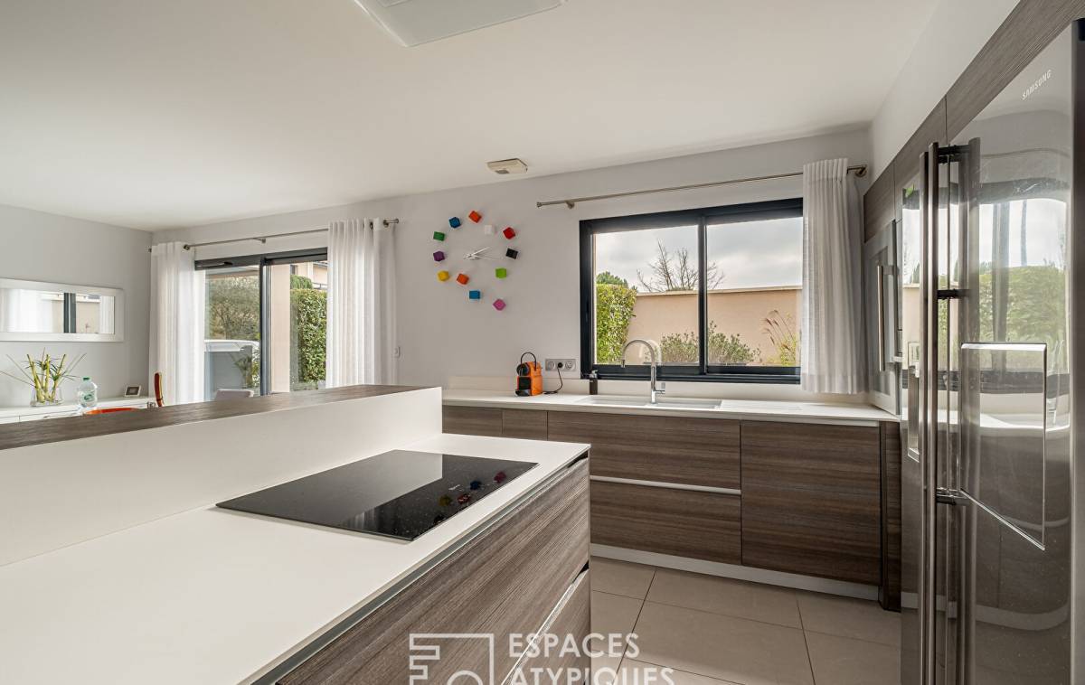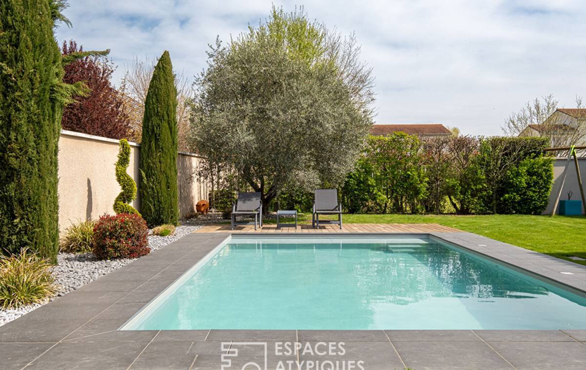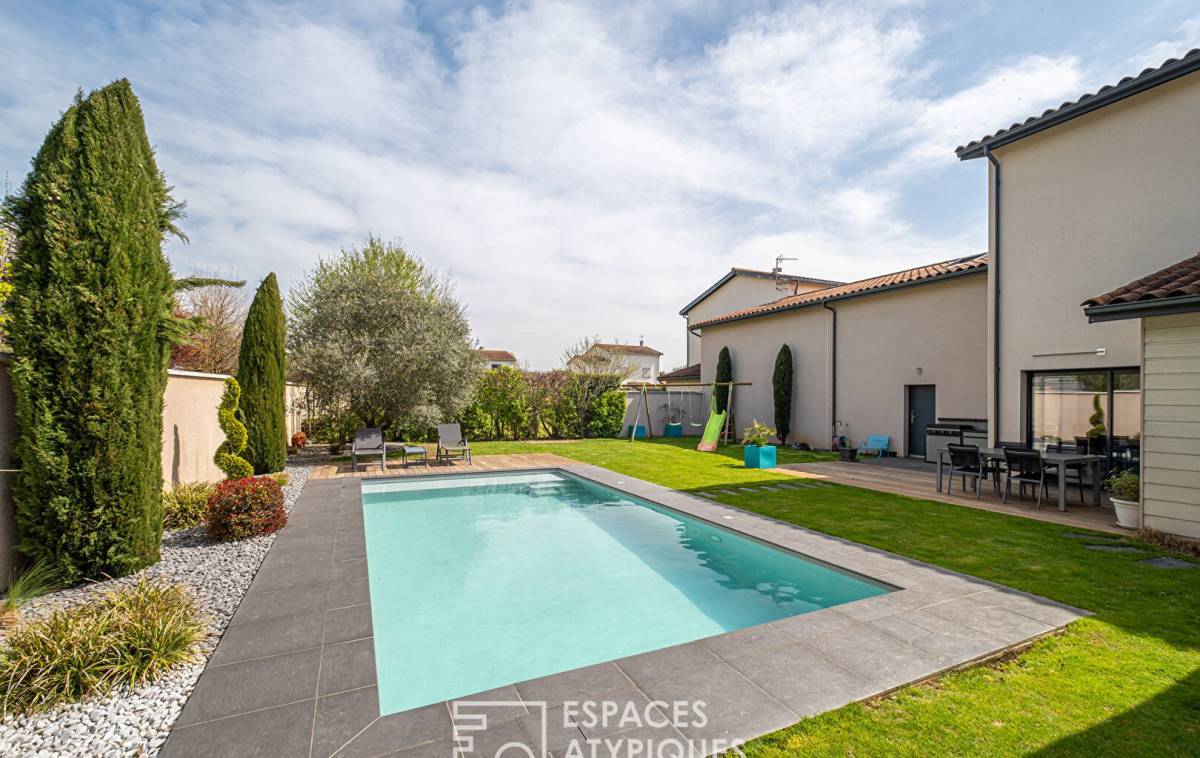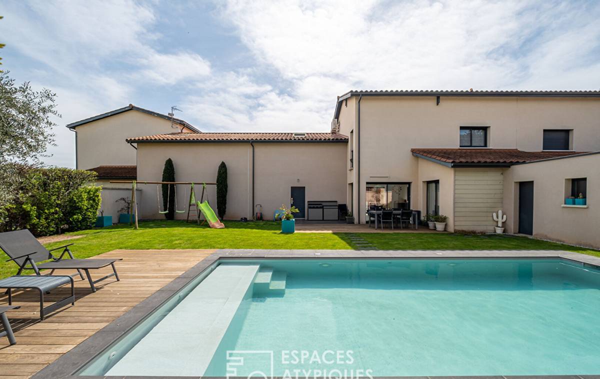 Located in Manissieux, this recent villa sits on a flat plot of 510 m2 with a swimming pool. From the entrance, designed as a cloakroom with a storage cupboard, the 50m2 living room is bathed in light thanks to large openings and benefiting from a through exposure. The custom-made kitchen is perfectly integrated into the room allowing for conviviality with its guests. On the night side, a bedroom with its own bathroom on the ground floor, upstairs are four bedrooms all with storage, including one of 20m2 with a dressing room. Bathroom and toilets complete this level. Parking is organized with a 39m2 garage as well as a parking space. The exterior of the house is carefully landscaped and arranged with the creation of several terraces allowing it to be enjoyed at any time of the year. The UV-treated and heated swimming pool is perfectly integrated into the land without vis-à-vis. A house without work, ready to live in a quiet area close to schools and small shops in Manissieux with proximity to the fast roads. Kindergarten, school, college 10 minutes away on foot. ENERGY CLASS: C / CLIMATE CLASS: C Estimated average amount of annual energy expenditure for standard use, established from energy prices for the year 2021, 2022 and 2023: between EUR1,490 and EUR2,070