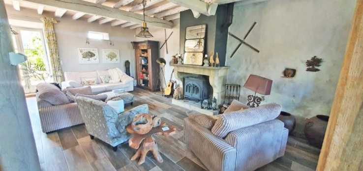 Main house – 342m2 : Entrance, shower room (shower, washbasin) with WC, Neptune solid wood Kitchen, fully equipped including Falcon cooker, living room with magnificent stone fireplace equipped with a wood burner. Storage room. Laundry room.