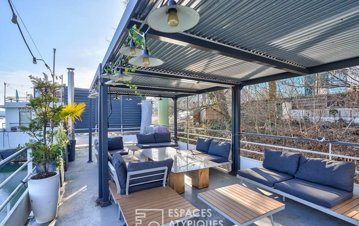 Located on the edge of the République district, near the Parc du Château, this Freycinet barge (39 meters long by 5 meters wide) has a total of 180 m2 of living space and benefits from a very large 100 m2 terrace. The interior was renovated in early 2024 with quality materials.