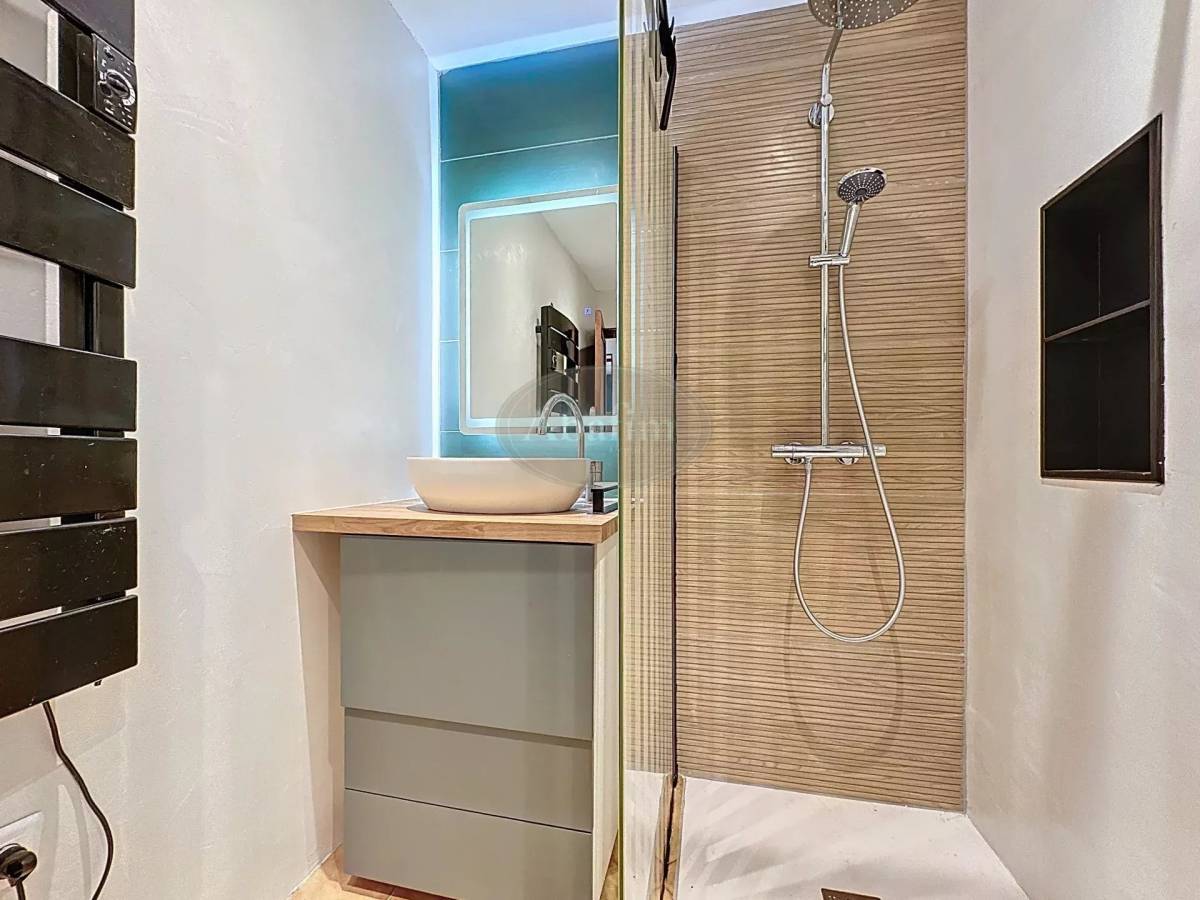 On the first floor, you'll find a fully-equipped kitchen opening onto the terrace and the lovely living room. The spacious living room is bright and airy thanks to the two French windows opening onto the terrace. The pellet stove will warm you up and will be a pleasure to contemplate thanks to its design. Both rooms face south.