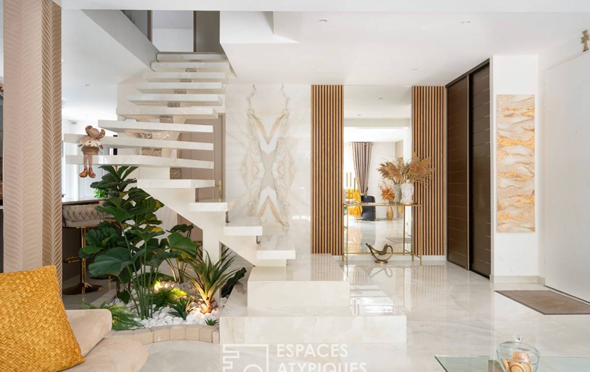 From the moment you enter, the atmosphere is striking: polished stone floors, powdery colours, a high-end feel and omnipresent light reveal an interior that has been treated with the utmost care. The vast living space, which runs through the property and is bathed in light, plays on transparency and reflections. It features a cosy lounge facing an integrated screen wall, a convivial dining room and a contemporary open-plan kitchen with minimalist lines and fully equipped. The whole space flows harmoniously into the garden, which is not overlooked, offering a natural and intimate extension on sunny days.